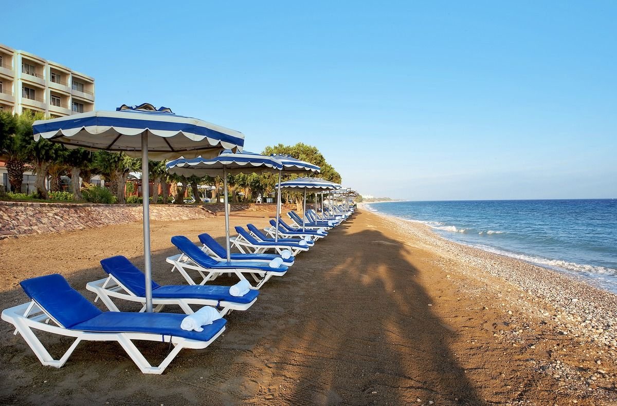 Ialyssos Beach, hotelowa, żwirkowa, łagodne zejście do morza (zalecane obuwie ochronne), bezpośrednio przy hotelu (ok. 20 m od recepcji), dojście przez ogród hotelowy, bezpłatne parasole, leżaki, materace i ręczniki.