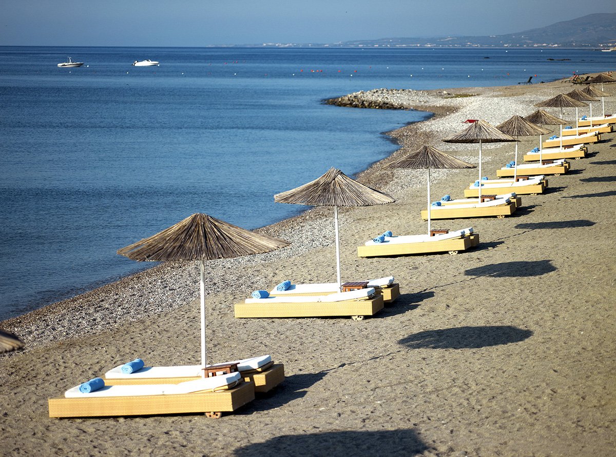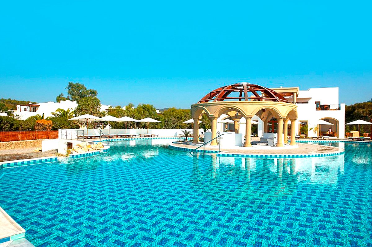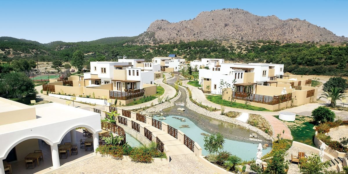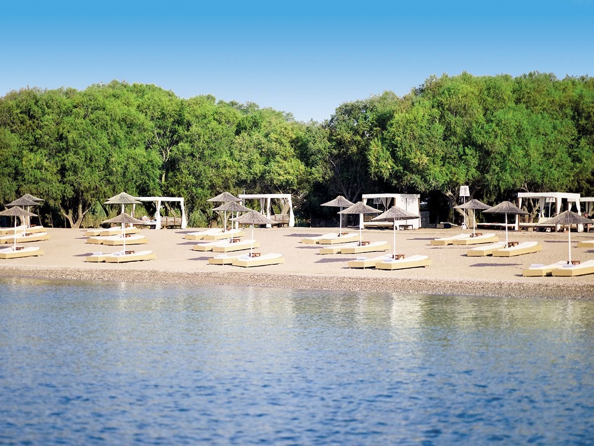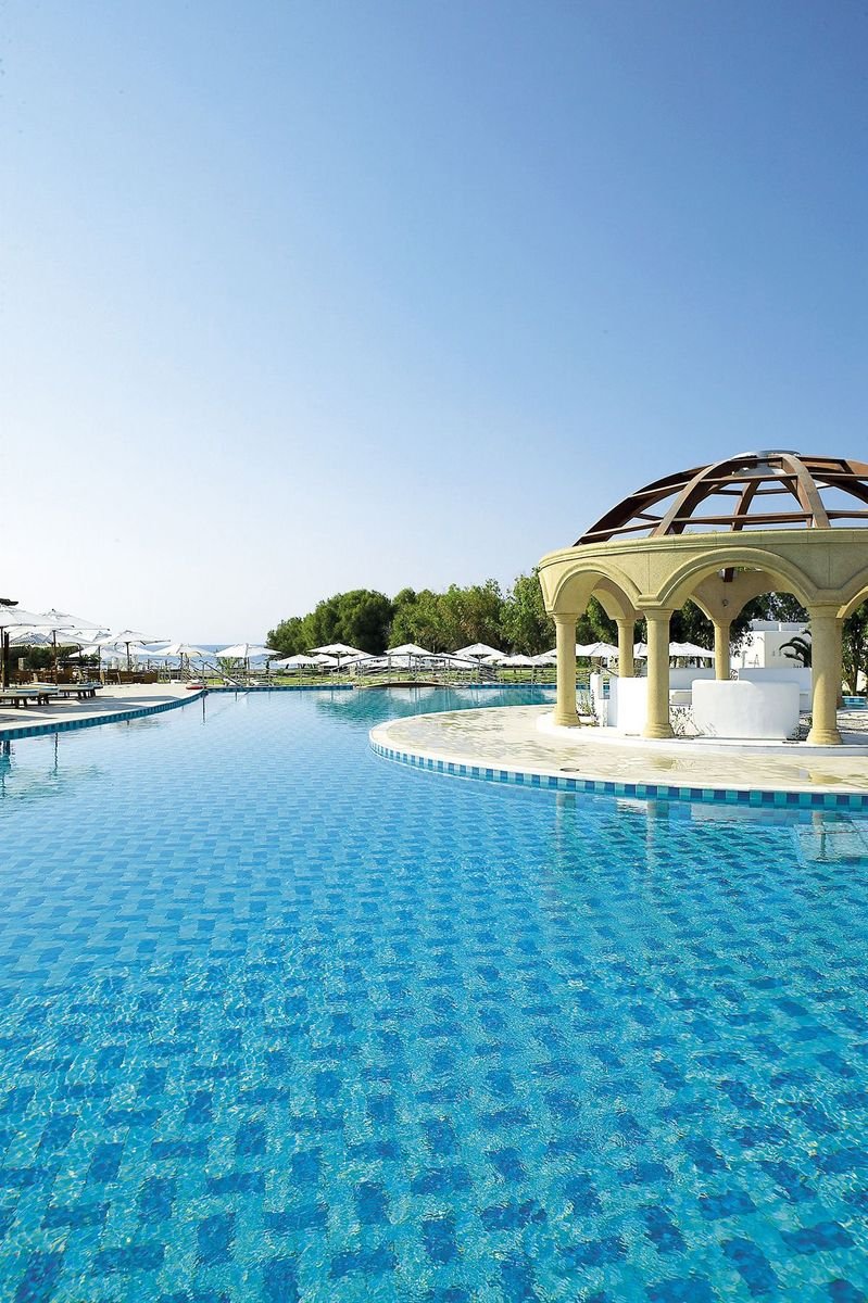 Hotel położony przy prywatnej, hotelowej, piaszczysto-żwirkowej plaży z darmowym serwisem, pośród ogrodu z śródziemnomorską roślinnością. Zbudowany w formie tradycyjnej greckiej wioski, urzeka bielą i błękitem, kolorami charakterystycznymi i kojarzonymi z tym krajem. Pięć znakomitych restauracji serwuje duży wybór dań, od kuchni greckiej i śródziemnomorskiej, przez doskonałe owoce morza, aż po pełne aromatów specjały kuchni włoskiej. Do dyspozycji Gości są dwa baseny oraz basen dla dzieci, świetne zaplecze sportowe i centrum spa z mnóstwem zabiegów upiększających i relaksujących.