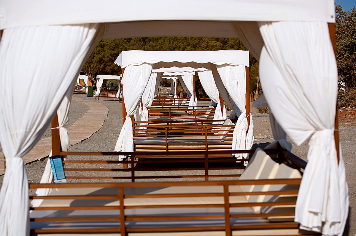 Lardos, hotelowa, piaszczysto-żwirkowo-kamienista, łagodne zejście do morza, wyróżniona certyfikatem Błękitna Flaga, bezpośrednio przy hotelu, do 500 m od hotelu (w zależności od zakwaterowania), dojście przez teren hotelu, bezpłatne parasole, leżaki, materace i ręczniki; Glystra, publiczna, piaszczysto-kamienista, łagodne zejście do morza, ok. 750 m od hotelu, dojście lokalną drogą, parasole, materace i leżaki płatne (ok. 15 EUR/komplet)