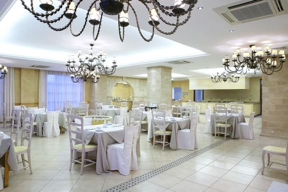 pięciogwiazdkowy, nowoczesny, zbudowany w 2004 r., częściowo odnowiony w 2018 r., 188 pokoi, budynek główny i 6 budynków pobocznych, 3 windy, eleganckie i przestronne lobby, całodobowa recepcja, 5 restauracji: główna – dania w formie bufetu, kuchnia lokalna i śródziemnomorska, Pelagos przy basenie - á la carte, kuchnia międzynarodowa, Helios z widokiem na morze – á la carte, ryby i owoce morza, Pizzaiolo - á la carte, kuchnia włoska, Basil przy basenie głównym – á la carte, kuchnia grecka i śródziemnomorska, w restauracjach dostępne foteliki i menu dla dzieci, dania wegetariańskie i bezglutenowe (na życzenie), 2 bary: La Piazza i przy basenie; minimarket, sejf w recepcji, wymiana walut, przechowalnia bagażu, parking; centrum konferencyjne dla 250 osób, ogród z roślinnością śródziemnomorską, bezpłatny internet bezprzewodowy; za opłatą: room-service, usługa konsjerża, opiekunka do dziecka, lekarz na wezwanie, usługa prania/prasowania, wypożyczalnia samochodów i rowerów; akceptowane karty kredytowe: Visa, MasterCard, American Express.