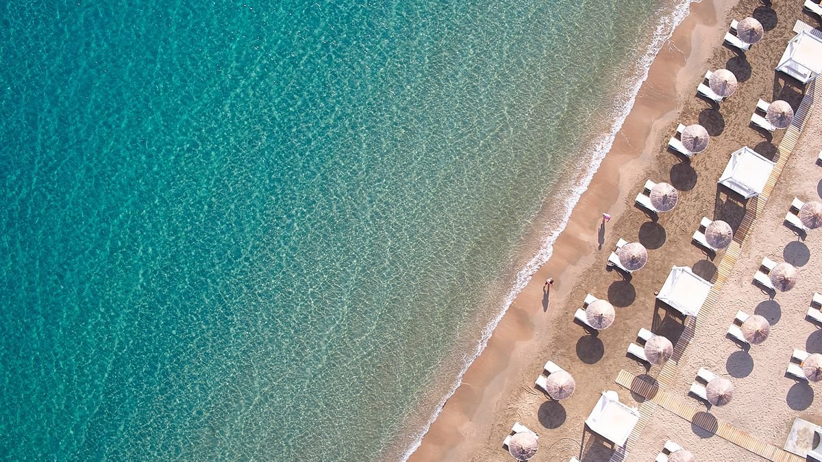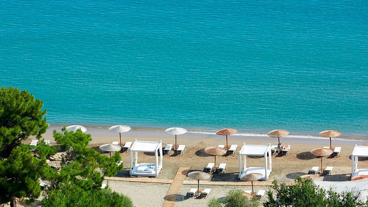 Vlicha, publiczna, wydzielona część hotelowa, piaszczysto-żwirkowa, łagodne zejście do morza, wyróżniona certyfikatem Błękitna Flaga, ok. 60-100 m od hotelu, zejście do plaży schodami lub zjazd windą, przejście ulicą, bezpłatne parasole, leżaki, materace i ręczniki.