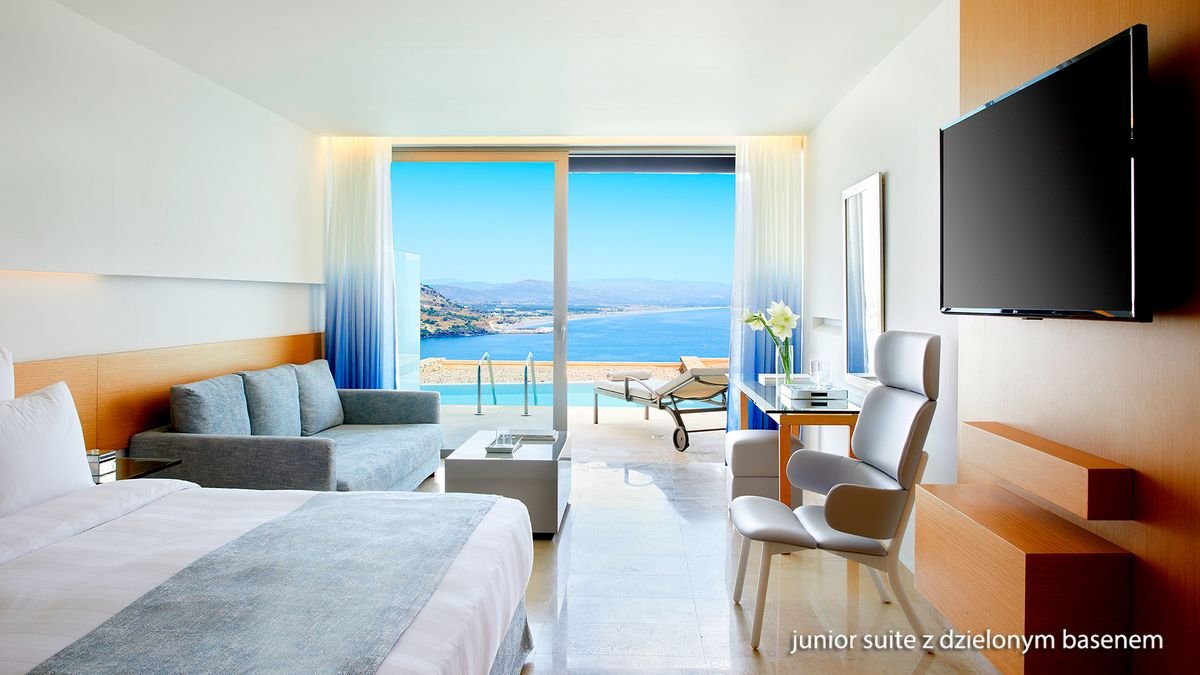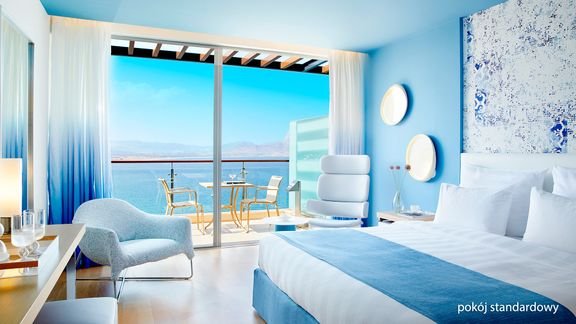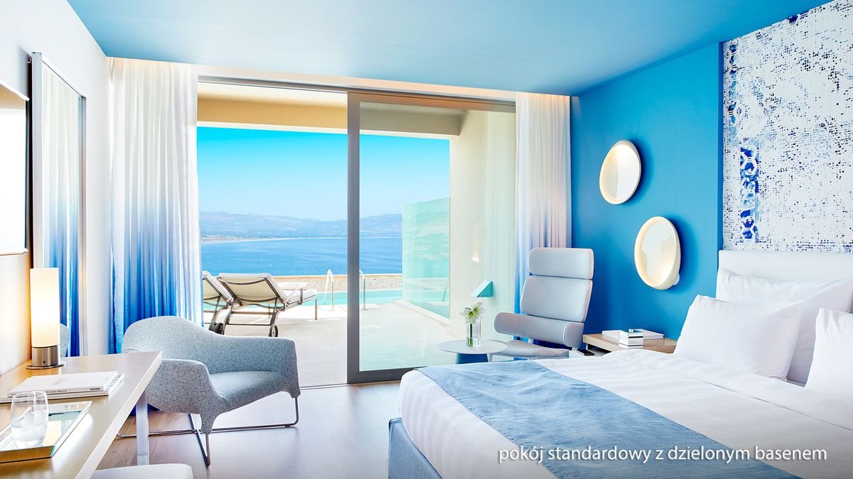 standardowy: 2-os., ok. 30 m², luksusowy, indywidualnie sterowana klimatyzacja, łazienka (wanna z hydromasażem, prysznic, wc; suszarka, szlafroki, kapcie), łóżko king size, internet bezprzewodowy, telewizja satelitarna, telefon, DVD i mp3, sejf, ekspres do kawy Nespresso, lodówka, minibar (płatny wg konsumpcji), menu poduszkowe; balkon lub taras (stolik i krzesełka), widok na morze; pokój z dzielonym basenem za dopłatą; junior suite: 2-os., ok. 38 m², wyposażenie jak w pokoju standardowym; balkon lub taras (stolik i krzesełka), widok na morze; pokój z dzielonym basenem za dopłatą.