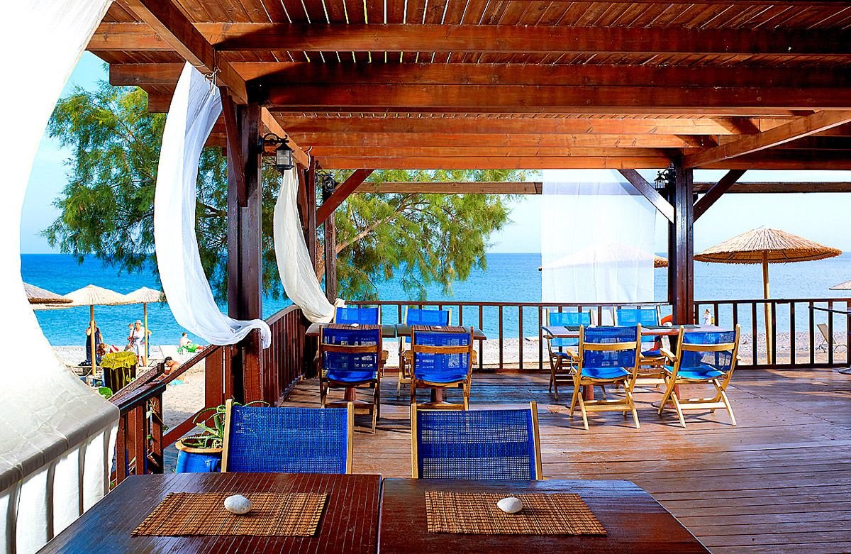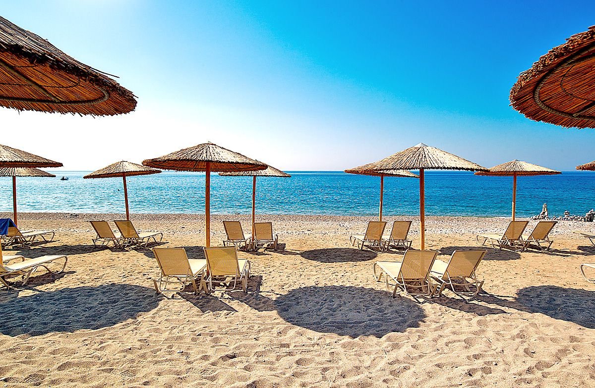 Kiotari Bay, publiczna, piaszczysto-żwirkowo-kamienista, łagodne zejście do morza, wyróżniona certyfikatem Błękitna Flaga, ok. 200 m od hotelu, dojście asfaltową drogą, tunelem podziemnym; parasole i leżaki płatne (ok. 7EUR/dzień/zestaw: 2 leżaki i parasol), ręczniki za kaucją (10 EUR; wymiana: 1 EUR); bar (płatny).