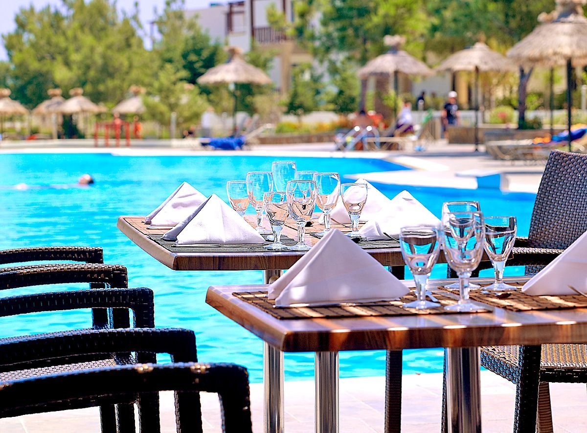 śniadanie (7.00-10.00), późne śniadanie (10.00-11.00), obiad (12.3014.30), kolacja (19.00-21.30) w formie bufetu w restauracji głównej; przekąski (10.00-21.00), lody (10.00-18.00) w snack barze; kawa, herbata i ciasto w wyznaczonym barze (15.30-16.30); napoje bezalkoholowe i lokalne napoje alkoholowe w barze przy basenie i w snack barze (10.00-23.00; wymagane noszenie opasek all inclusive.