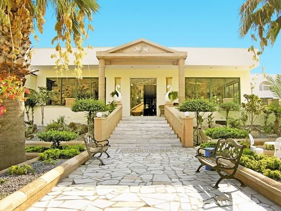 trzygwiazdkowy, skromny, wybudowany w 1990 r., zimą 2013/2014 r. planowany remont budynku głównego; 106 pokoi, 3 budynki, 2 piętra, winda, duże lobby, całodobowa recepcja; restauracja Olivina – dania w formie bufetu, kuchnia grecka i międzynarodowa, dania wegetariańskie, dostępne foteliki i menu dla dzieci; 2 bary przy basenie; minimarket (czynny: 8.00-23.00); taras z widokiem na ogród, duży ogród z roślinnością śródziemnomorską; za opłatą: sejf w recepcji (dla Gości pokoi standardowych, ok. 12 EUR/tydz.), punkt internetowy (ok. 2 EUR/godz.), internet bezprzewodowy (ok. 5 EUR/dzień; ok. 12 EUR/3 dni; ok. 20 EUR/tydzień); akceptowane karty kredytowe: Visa, MasterCard.