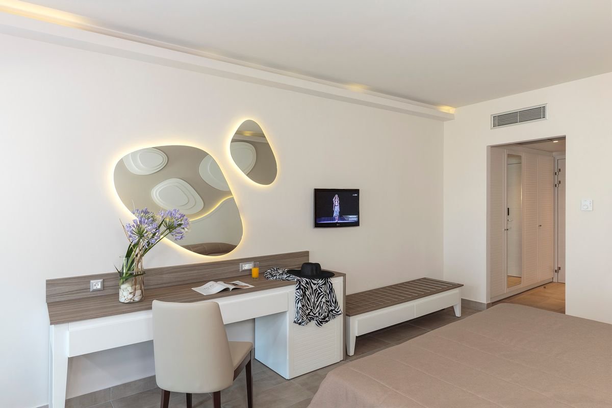 2-os. (możliwość 1 dostawki – sofa lub wersalka), klimatyzowany (w terminie: czerwiec-wrzesień), łazienka (prysznic, wc; suszarka), dostęp do internetu, telewizor, telefon, minibar, sejf; balkon lub taras; inne pokoje za dopłatą.