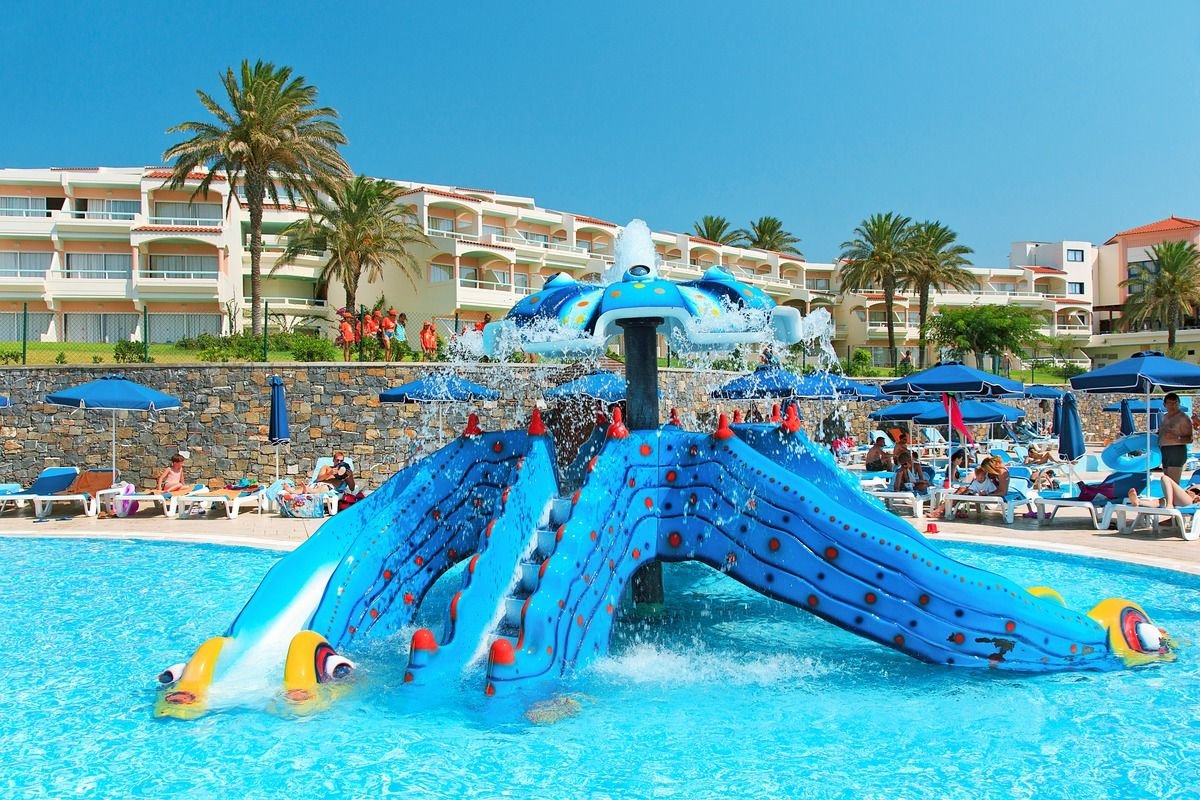 3 baseny, słodka woda: nieregularny kształt, ok. 500 m², gł. 0,4-2,1 m, kryty basen, prostokątny kształt, ok. 100 m², gł. 1,0-1,8 m, kwadratowy kształt, słodka woda, ok. 300 m², gł. ok. 1,8 m, zjeżdżalnia, zjeżdżalnia dla dzieci w kształcie ośmiornicy, brodzik dla dzieci, słodka woda, ok. 80 m², gł. 0,6 m, przy basenach bezpłatne parasole, leżaki i ręczniki; 2 korty tenisowe (oświetlenie płatne: ok. 15 EUR/godz.) z wypożyczalnią sprzętu, piłka nożna, łucznictwo, siatkówka plażowa, piłka nożna na plaży, koszykówka, minigolf, tenis stołowy; plac i pokój zabaw dla dzieci, miniklub (4-12 lat), amfiteatr, animacje dla dorosłych i dzieci, raz w tygodniu wieczór grecki.