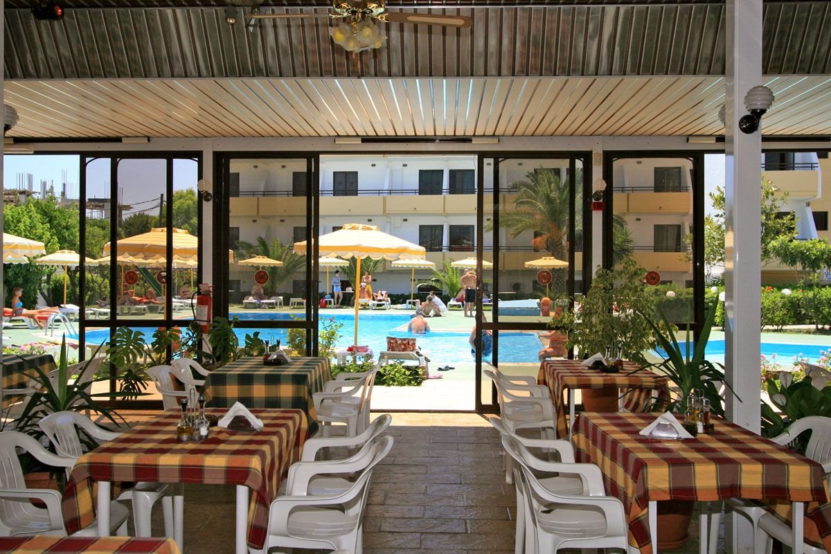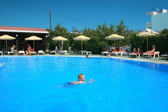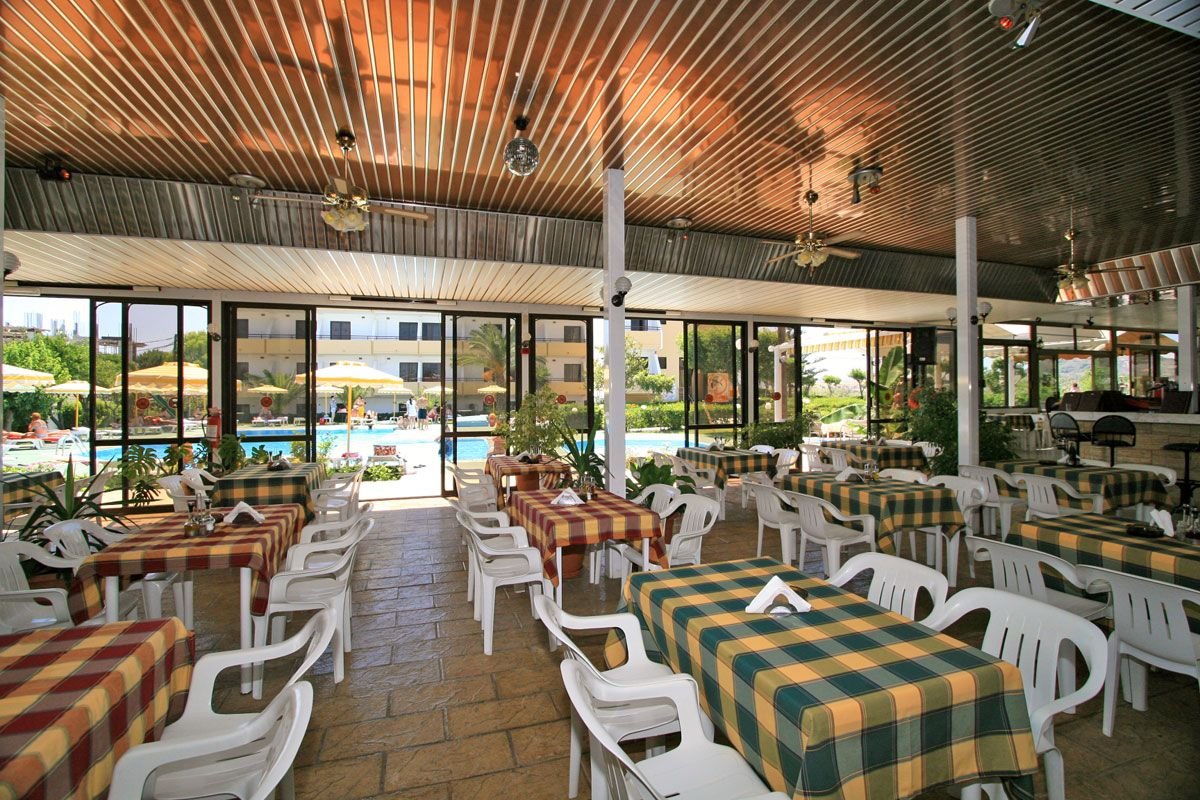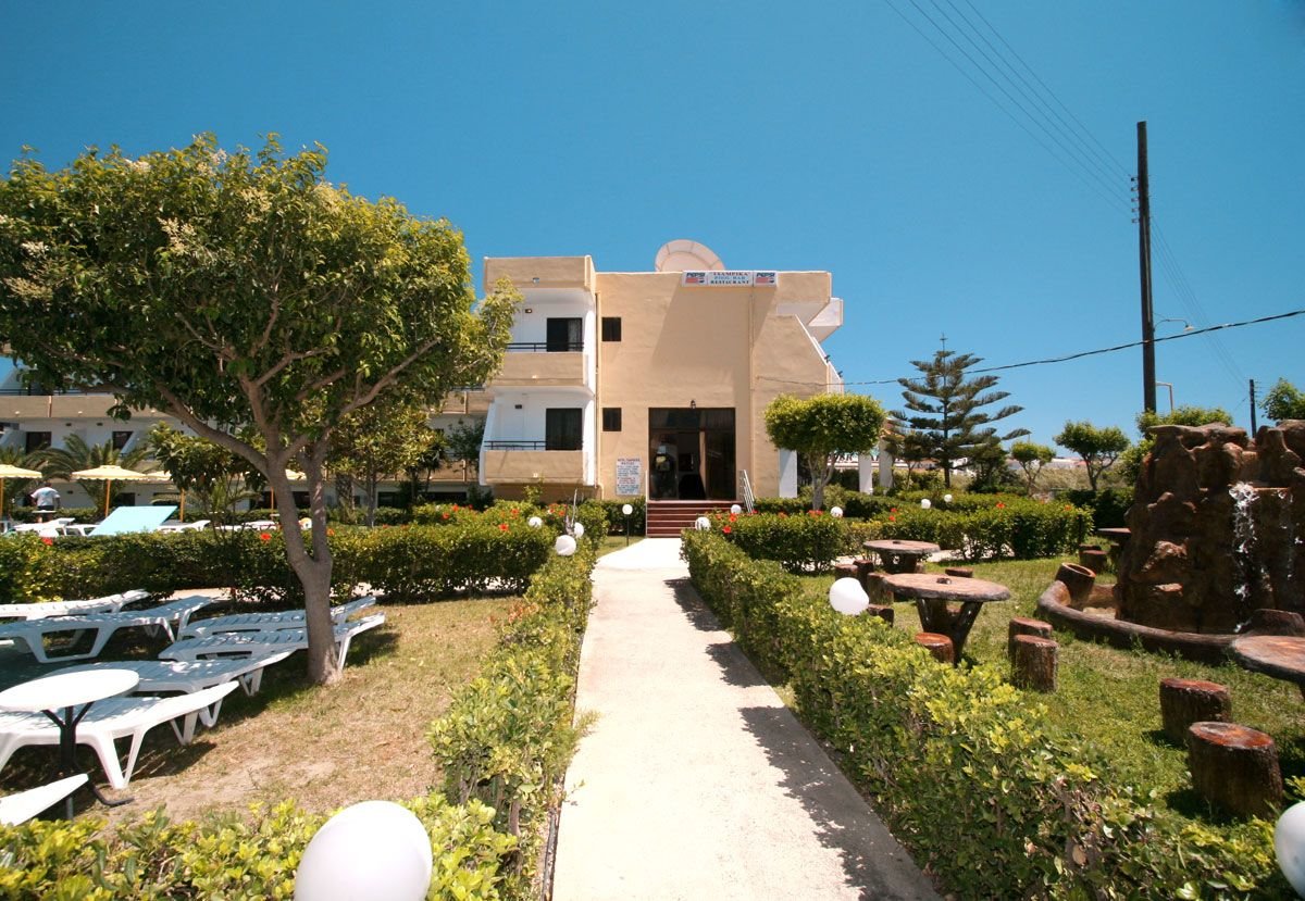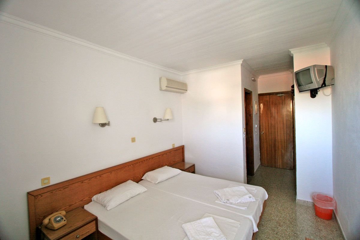 trzygwiazdkowy, greckiej kategorii C, otoczony zielenią, zbudowany w 1990 r., odnowiony w 2007 r., 60 pokoi, budynek główny i kilka bocznych dwupiętrowych, recepcja, lobby, restauracja - kuchnia międzynarodowa, dania w formie bufetu, bar przy basenie; sala telewizyjna, bezpłatny internet bezprzewodowy w lobby; za opłatą: sejf w recepcji (ok. 20 EUR/tydz.), kącik internetowy (ok. 3 EUR/godz.).