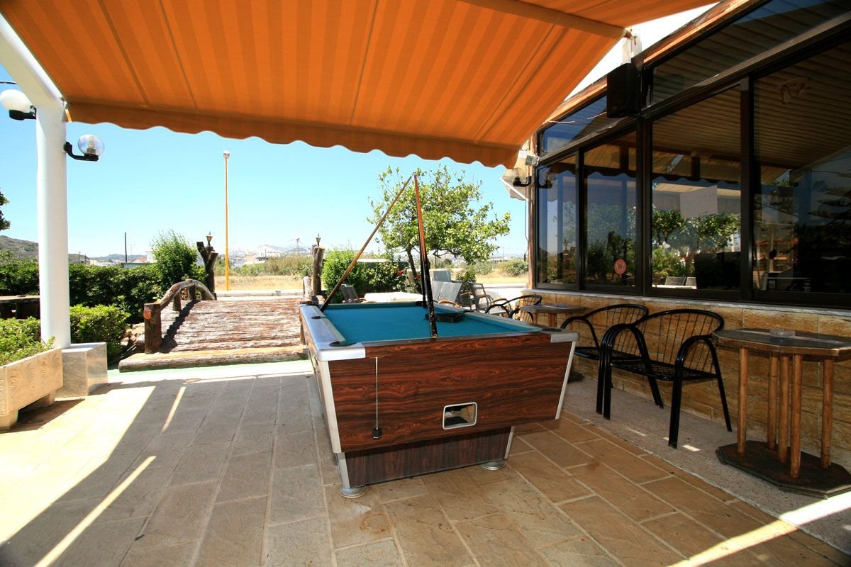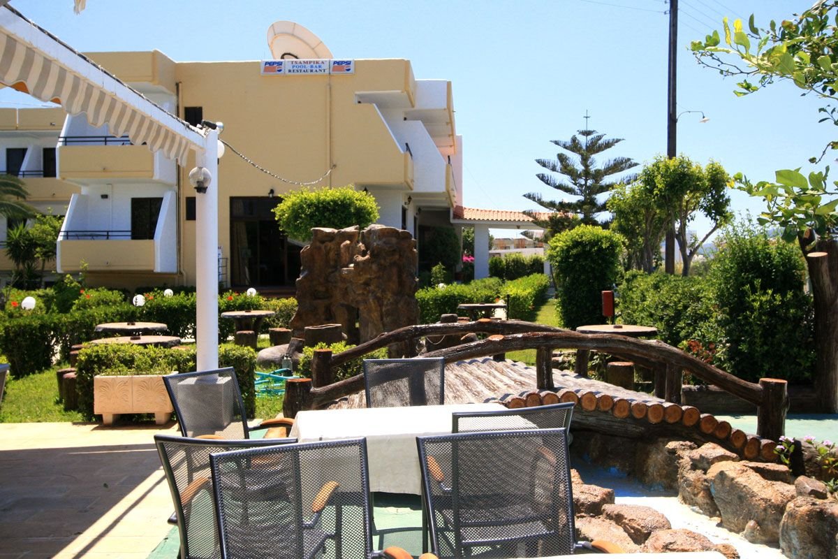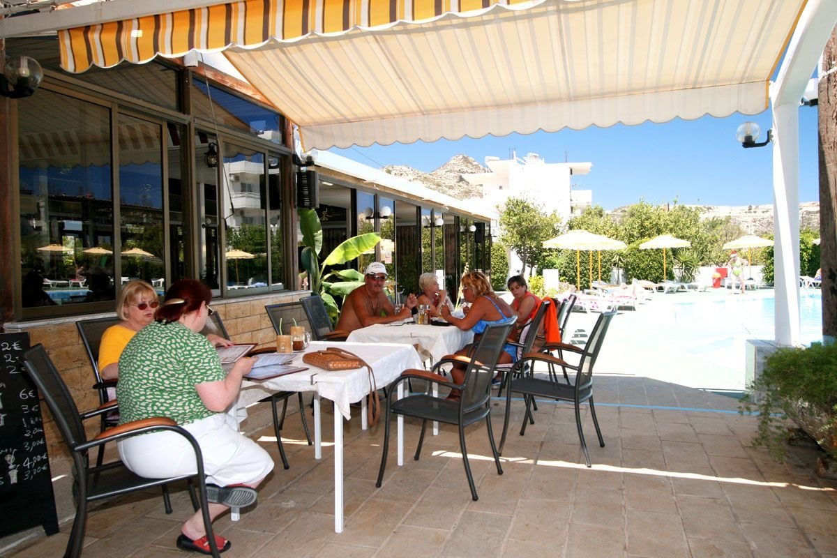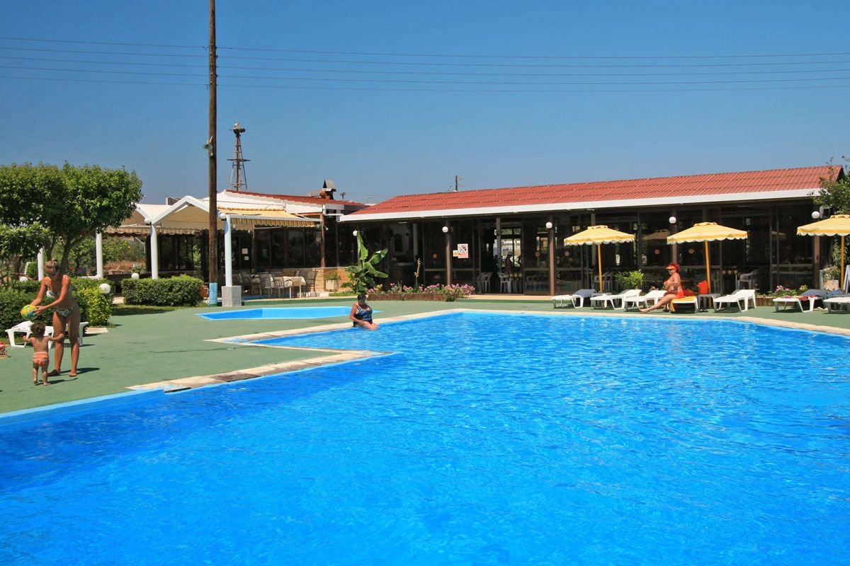 trzygwiazdkowy, greckiej kategorii C, otoczony zielenią, zbudowany w 1990 r., odnowiony w 2007 r., 60 pokoi, budynek główny i kilka bocznych dwupiętrowych, recepcja, lobby, restauracja - kuchnia międzynarodowa, dania w formie bufetu, bar przy basenie; sala telewizyjna, bezpłatny internet bezprzewodowy w lobby; za opłatą: sejf w recepcji (ok. 20 EUR/tydz.), kącik internetowy (ok. 3 EUR/godz.).