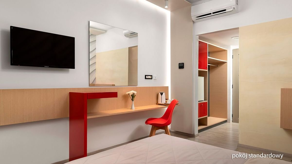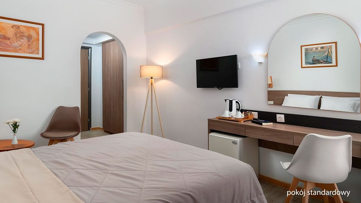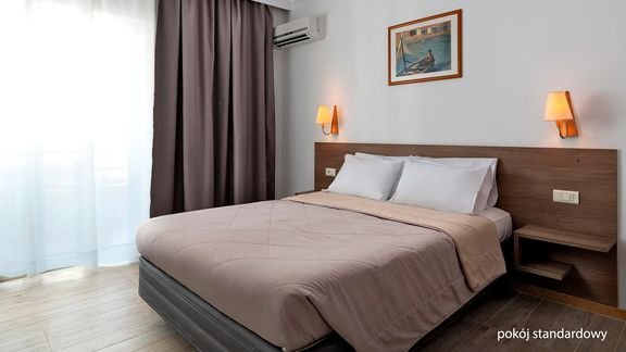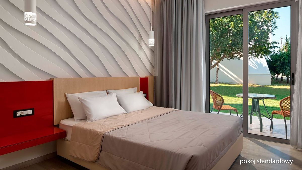 standardowy: 2-os. (możliwość 1 dostawki), ok. 25 m2, klimatyzowany (bezpłatnie w terminie: 15.06-15.09, w pozostałych terminach za opłatą), łazienka (prysznic, wc; suszarka), internet bezprzewodowy (płatny, ok. 6 EUR/dzień), telewizja satelitarna, telefon, sejf, zestaw do kawy/herbaty, mała lodówka; bezpłatne łóżeczko dla dziecka do 2 lat na zamówienie przed przyjazdem; balkon lub taras (stolik i krzesełka), widok na ogród lub okolicę; standard: 2-os. (możliwość 1 dostawki), ok. 28 m2, wyposażenie jak w pokoju standardowym; balkon lub taras (stolik i krzesełka), widok na ogród lub okolicę; family: 6-os. (maks. 5 os. dorosłych), ok. 46 m2, wyposażenie jak w pokoju standardowym, dodatkowo: 2 sypialnie oddzielone drzwiami; balkon lub taras (stolik i krzesełka), widok na ogród lub okolicę; suite z jacuzzi: 2-os. (możliwość 2 dostawek), ok. 45 m2, wyposażenie jak w pokoju standardowym; dodatkowo: wanna w łazience, pokój dzienny i sypialnia oddzielone drzwiami; balkon (stolik i krzesełka), prywatne jacuzzi, widok na ogród lub okolicę; suite z prywatnym basenem: 2-os. (możliwość 2 dostawek), ok. 45 m2, wyposażenie jak w pokoju standardowym; dodatkowo: wanna w łazience, pokój dzienny i sypialnia oddzielone drzwiami; taras (stolik i krzesełka), dostęp do prywatnego basenu, widok na ogród lub okolicę; pokoje: standard, family, suite z jacuzzi i suite z prywatnym basenem za dopłatą.