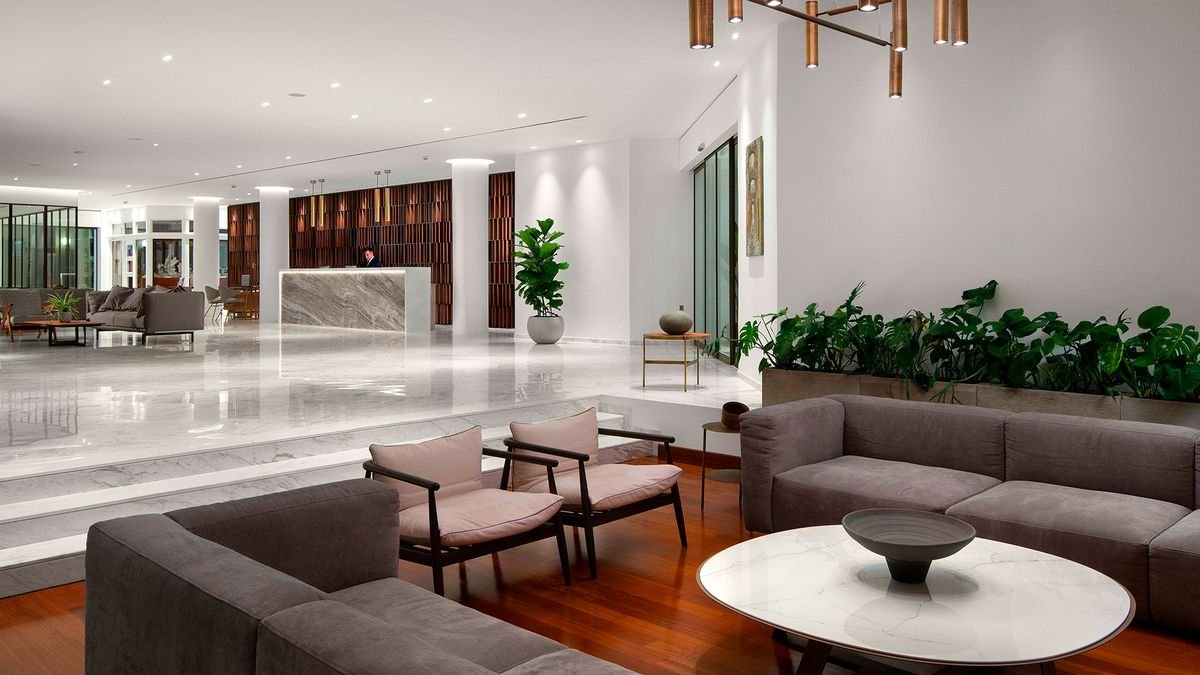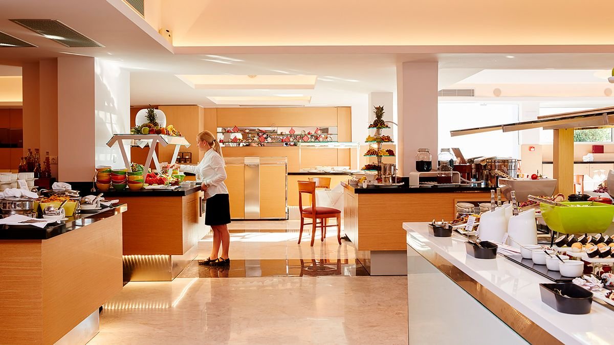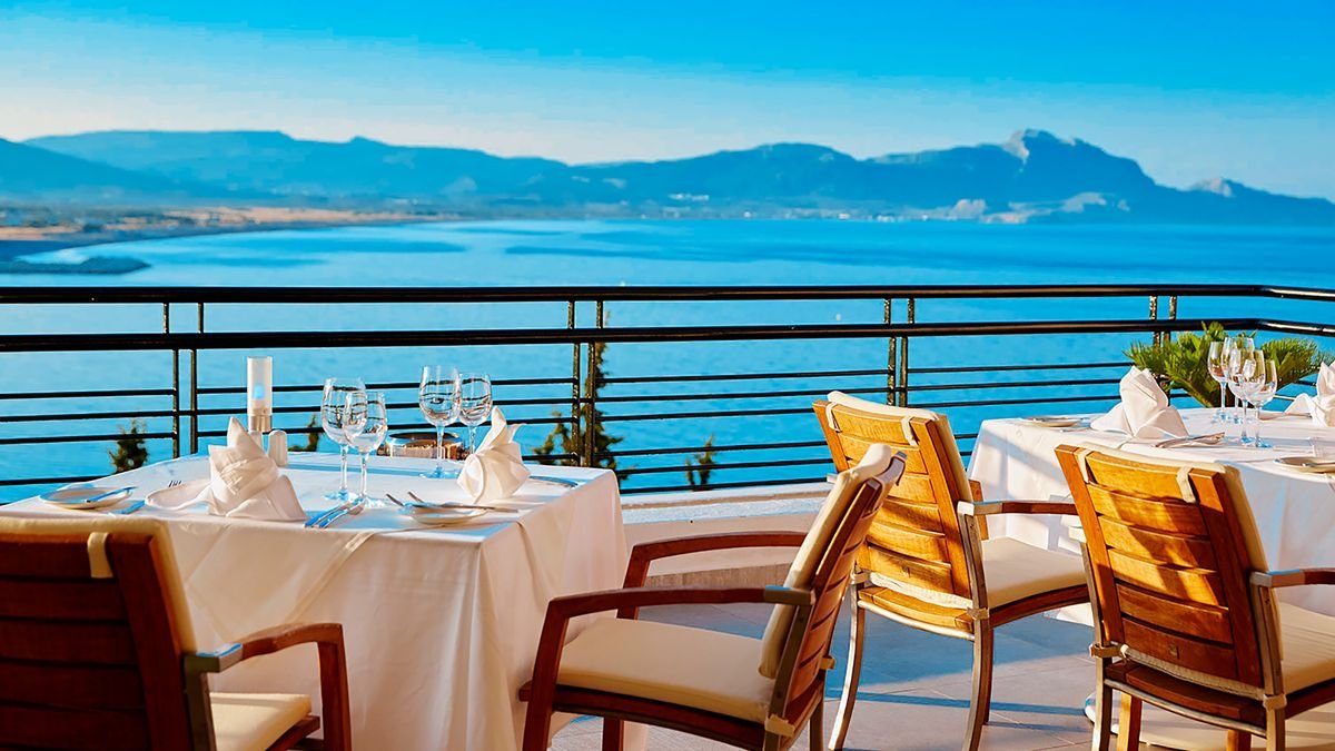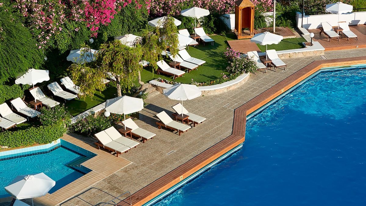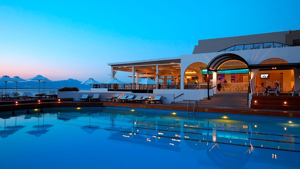 pięciogwiazdkowy, zbudowany w 1992 r., częściowo odnowiony w 2021 r., 159 pokoi, kilka budynków, 3-4 piętra, 4 windy, przestronne, eleganckie lobby, całodobowa recepcja, restauracja główna Estia – dania w formie bufetu, kuchnia grecka i międzynarodowa, dieta bezglutenowa (na zamówienie), dieta wegetariańska, 2 restauracje tematyczne à la carte (wymagana wcześniejsza rezerwacja): Pelagos przy głównym basenie – kuchnia grecka, Meltemi na plaży - kuchnia śródziemnomorska, w restauracjach dostępne foteliki i menu dla dzieci, podczas kolacji wymagany strój formalny (panowie – długie spodnie), lounge bar Vergina z panoramicznym widokiem na morze, bary przy basenie: Pelagos i Meltemi, bar na plaży; kantor, minimarket, jubiler, parking; taras z widokiem na morze, ogród, bezpłatny internet bezprzewodowy w hotelu i na plaży; za opłatą: room-service (7.00-1.00), opiekunka do dziecka (na zamówienie), lekarz na wezwanie, pralnia, wypożyczalnia samochodów; na terenie hotelu występują różnice poziomów - nie jest polecany osobom z ograniczeniami ruchowymi; akceptowane karty kredytowe: Visa, MasterCard, American Express, Diners Club.