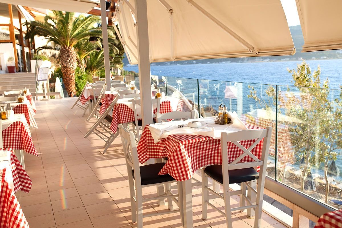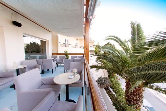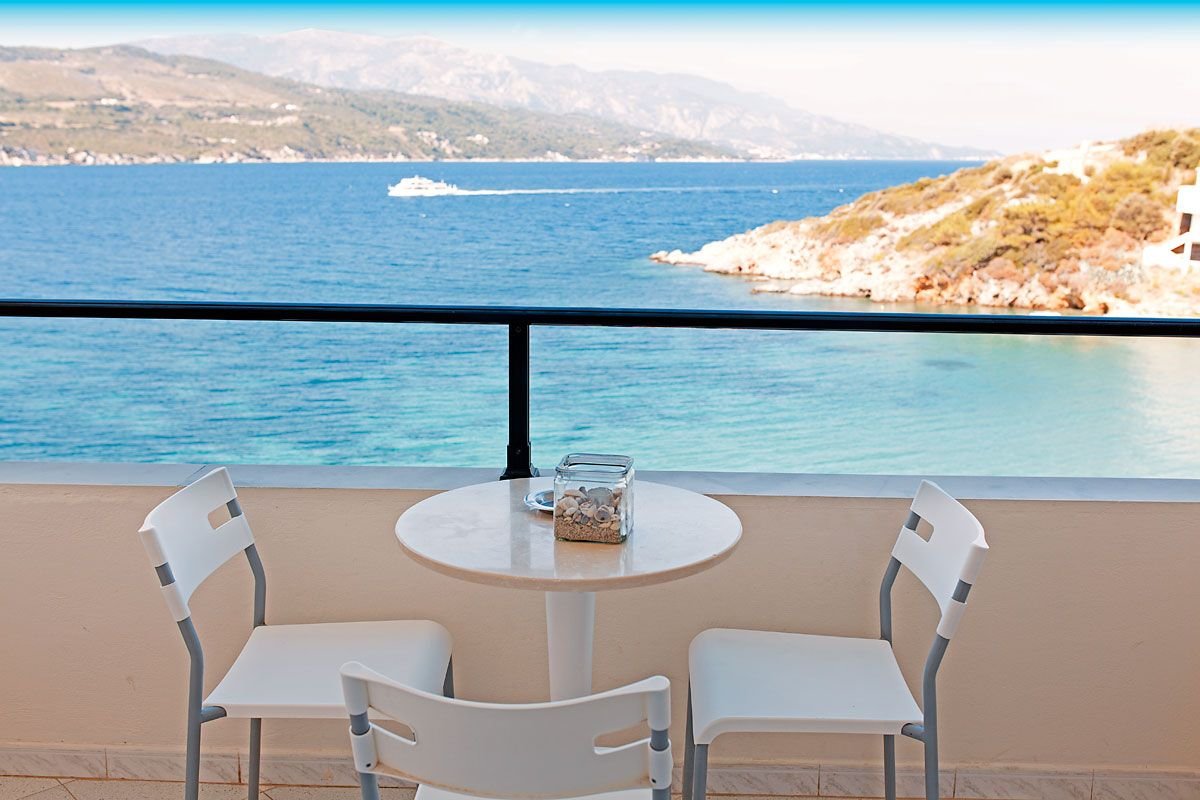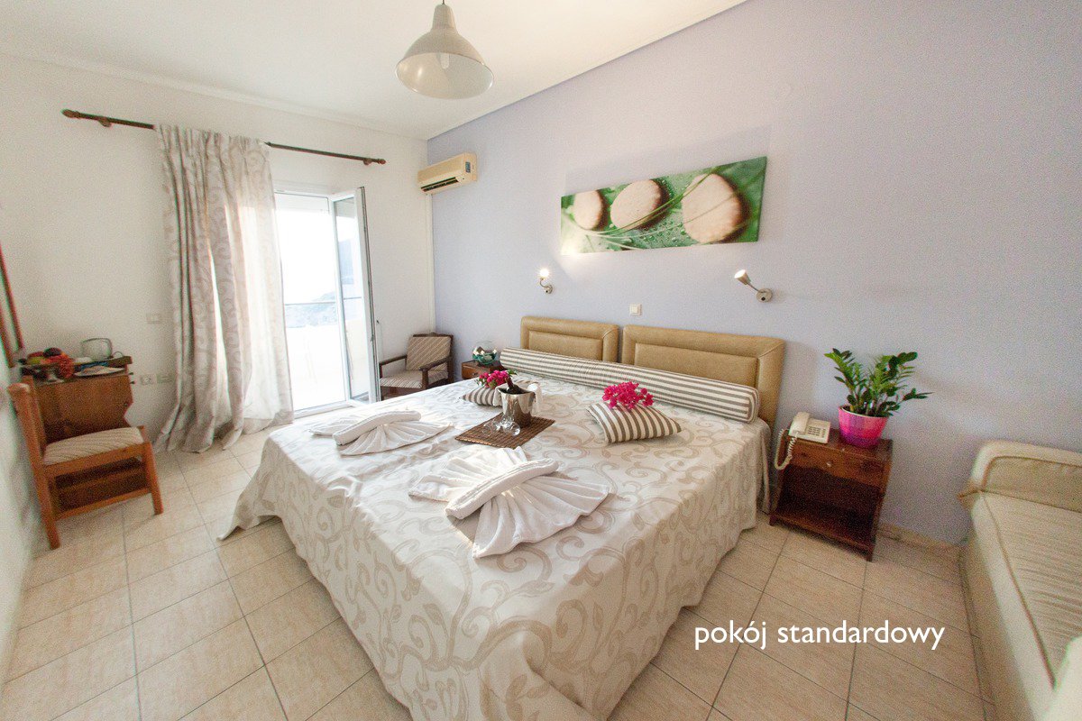 trzygwiazdkowy, zadbany, regularnie odnawiany, 70 pokoi, 1 budynek, 4 piętra, 2 windy, przestronne lobby, całodobowa recepcja, restauracja – obsługa kelnerska, kuchnia grecka i międzynarodowa, dostępne foteliki dla dzieci, bar w lobby i na tarasie; taras z widokiem na zatokę, bezpłatny internet bezprzewodowy w pokojach; za opłatą: punkt internetowy (3 EUR/godz.), room-service; w hotelu występują różnice poziomów; akceptowane karty kredytowe: Visa, Master Card.