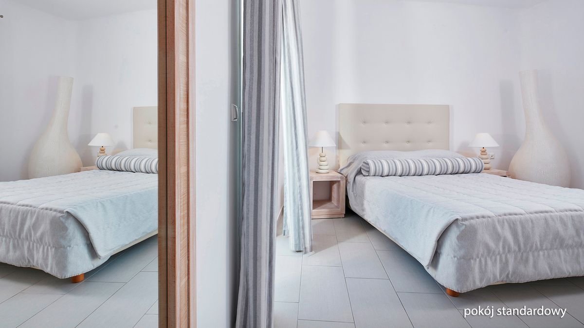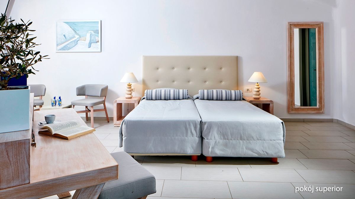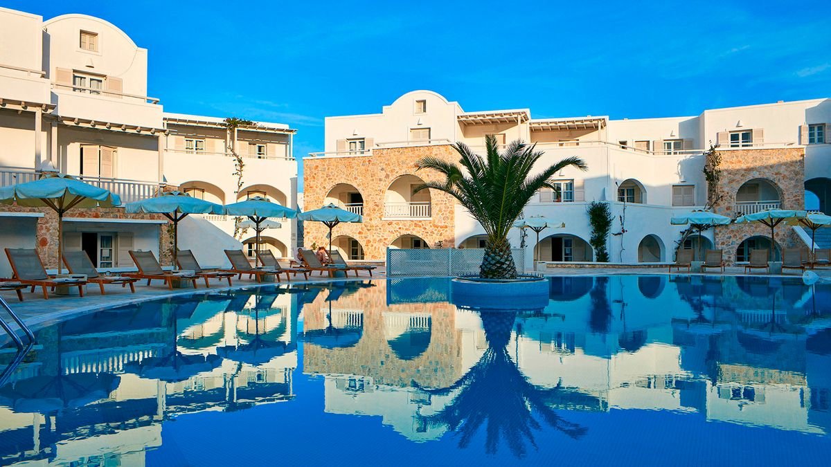 Oczarowuje piękną architekturą w stylu cykladzkim, idealnie harmonizującą z otoczeniem. Bardzo zadbany, z estetycznymi wnętrzami w tradycyjnej, pogodnej kolorystyce, wyposażony jest we wszystkie udogodnienia, gwarantujące udany pobyt. Komfortowe, nienagannie utrzymane pokoje, wszystkie są nieskazitelnie utrzymane i ładnie umeblowane, z lokalnymi akcentami. Centralnym miejscem hotelu jest piękny basen z barem, gdzie koncentruje się leniwe wakacyjne życie. Idealne miejsce także dla miłośników rozrywek - tylko parę minut spacerem do centrum Kamari, gdzie czekają bary, restauracje i tawerny, dyskoteki i sklepy. Jeszcze bliżej jest do popularnej czarnej plaży pochodzenia wulkanicznego.