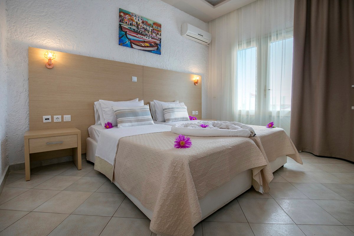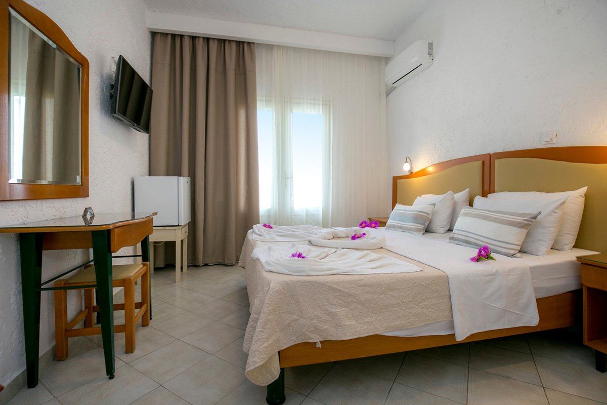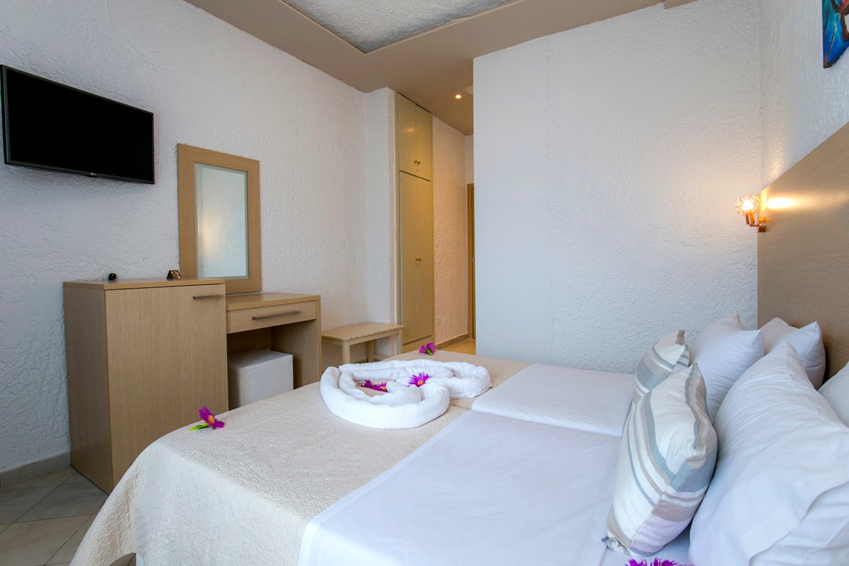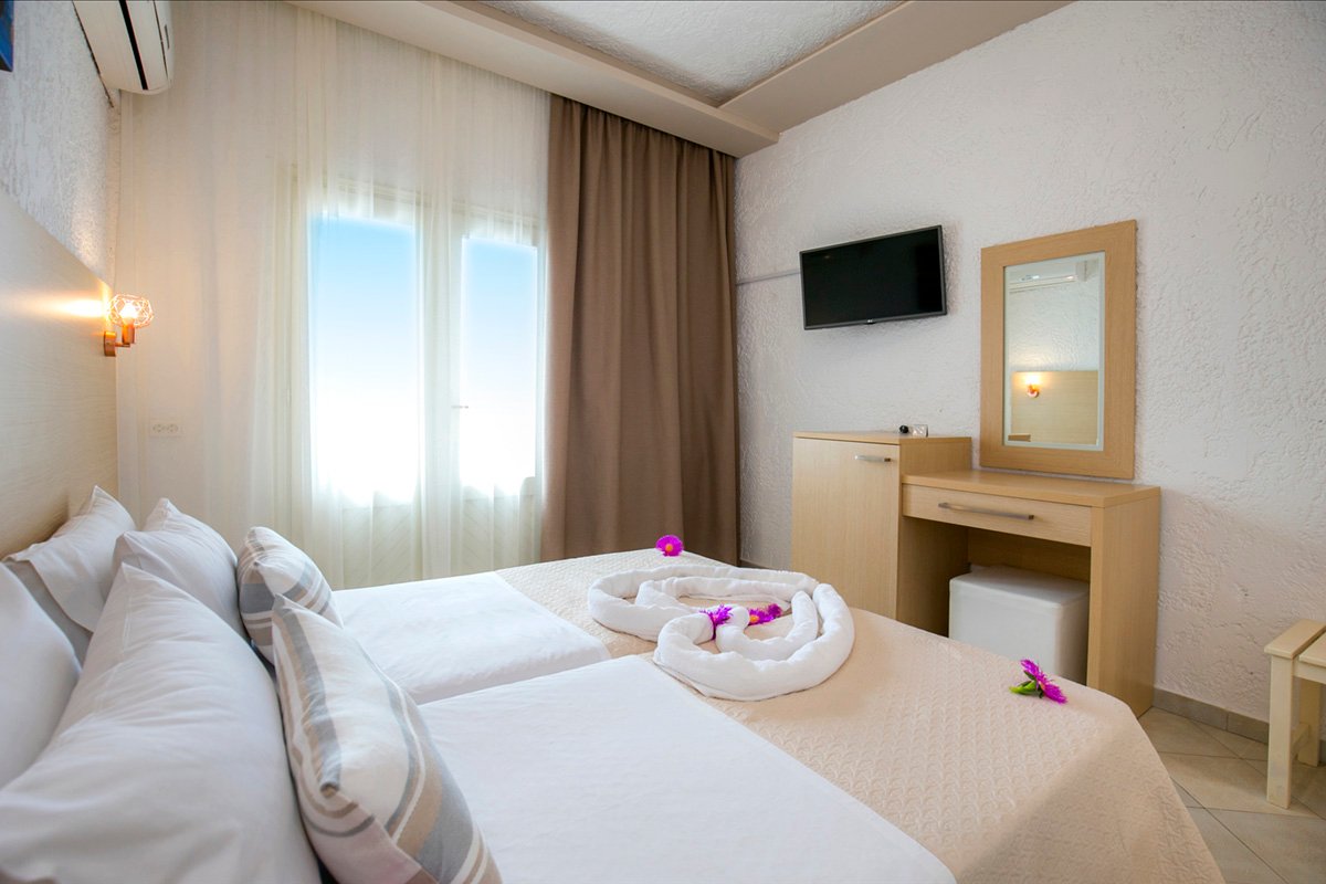 standardowy: 2-os. (możliwość 1 dostawki dla dziecka), ok. 15 m², zadbany, indywidualnie sterowana klimatyzacja, łazienka (prysznic, wc; suszarka), internet bezprzewodowy, telewizja satelitarna, telefon, lodówka, sejf (płatny, ok. 1 EUR/dzień); bezpłatne łóżeczko dla dziecka do 2 lat (na zamówienie przed przyjazdem); balkon lub ogródek (stolik i krzesełka), widok na ulicę, ogród, góry lub basen.