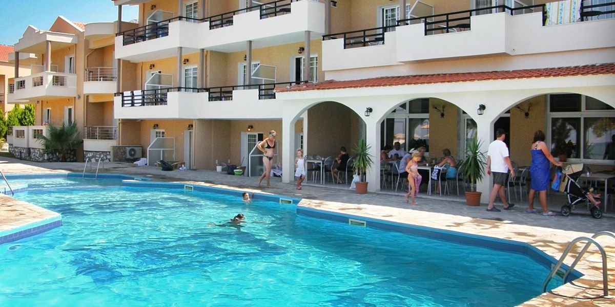 trzygwiazdkowy, skromny i zadbany, zbudowany w 1996 r., rozbudowany w 2006 r., pokoje superior odnowione w 2013 r., 109 pokoi, 1 budynek, 2 piętra; hol, recepcja (czynna: 7.30-23.00), restauracja – dania w formie bufetu, kuchnia międzynarodowa i grecka, dostępne foteliki dla dzieci, dania wegetariańskie; bar; niepolecany osobom z ograniczeniami ruchowymi; akceptowane karty kredytowe: Visa, MasterCard.