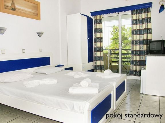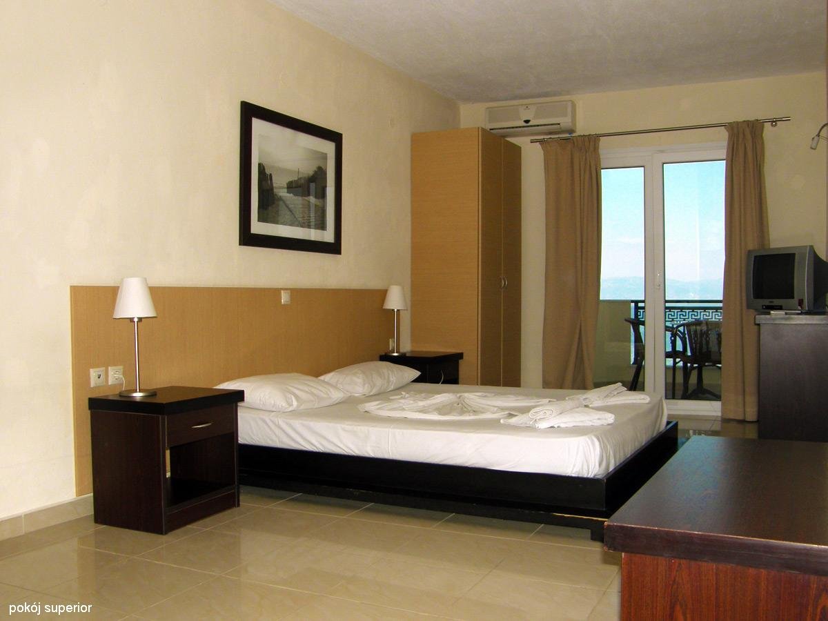 standardowy: 2-os. (możliwość 1 dostawki dla dziecka), skromny i zadbany, ok. 18 m², indywidualnie sterowana klimatyzacja (płatna: ok. 4,5 EUR/dzień), łazienka (prysznic, wc; suszarka), lodówka, telewizja satelitarna, polskie programy, telefon, sejf (płatny: ok. 1,5 EUR/dzień), bezpłatny internet bezprzewodowy; bezpłatne łóżeczko dla dziecka do 2 lat na zamówienie przed przyjazdem; balkon (stolik i krzesełka); superior: 2-os. (możliwość 1 dostawki), odnowiony, zadbany i nowoczesny, ok. 20 m², wyposażenie jak w pokoju standardowym, nowsze meble; pokój superior za dopłatą.