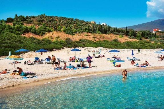 ok. 10 m od hotelu, publiczna, w małej zatoczce, żwirkowo-kamienista, bez serwisu plażowego (można zabrać leżaki z hotelu); ok. 650 m od hotelu, publiczna, piaszczysto-żwirkowa, łagodne zejście do morza, parasole i leżaki płatne (ok. 7 EUR/dzień), przy plaży tawerna.