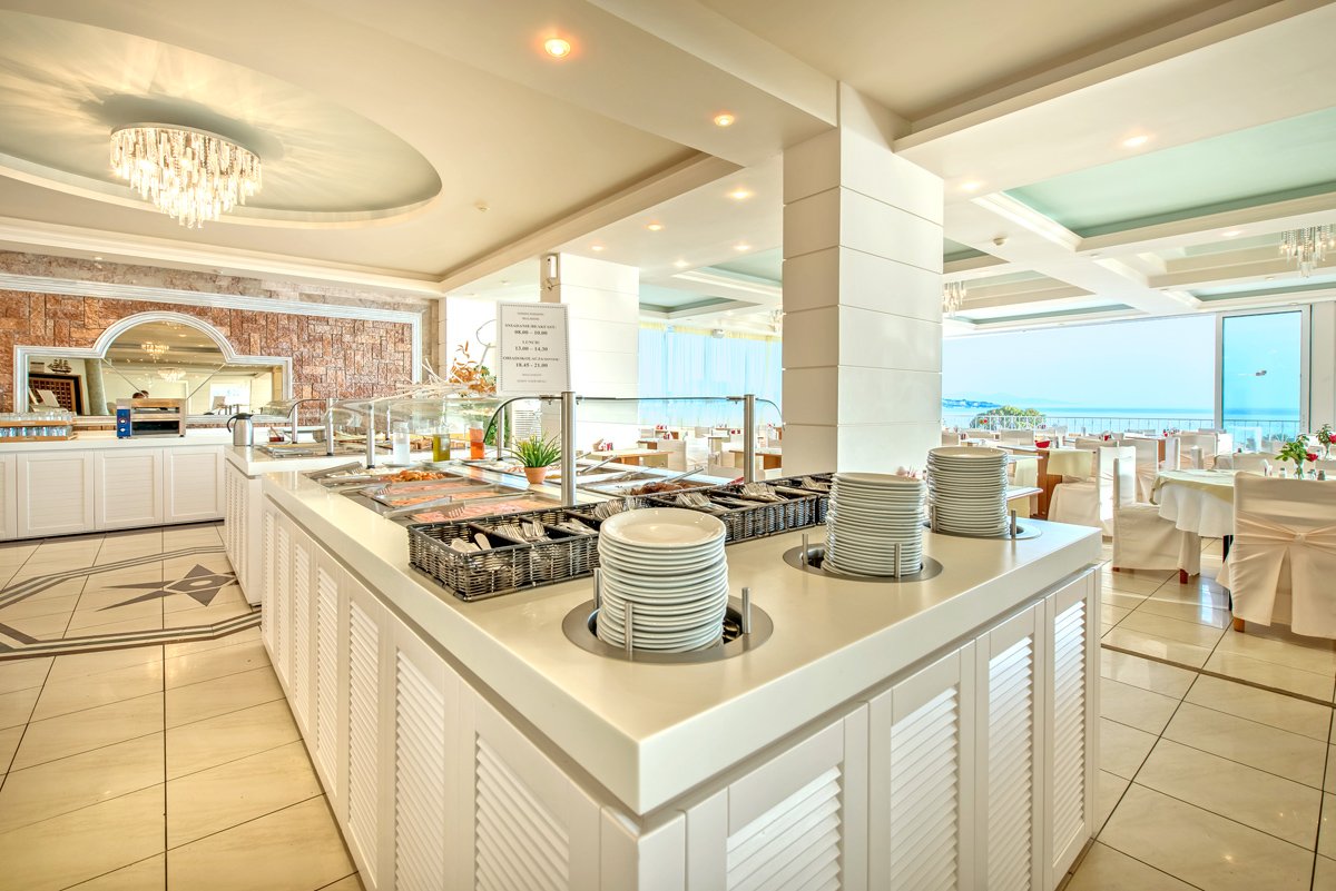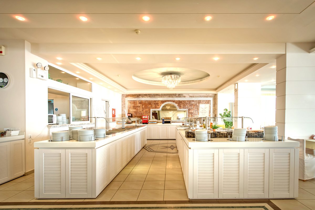 śniadanie (8.00-10.00), obiad (13.00-14.30), kolacja (19.00-21.00) w formie bufetu w restauracji; podwieczorek w barze (15.00-17.00); napoje bezalkoholowe i lokalne napoje alkoholowe w barze (10.00-23.00); wymagane noszenie opasek all inclusive.