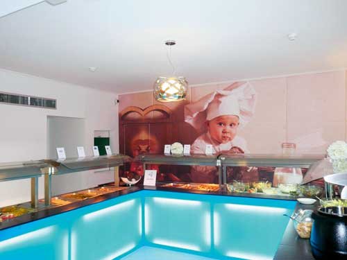 śniadanie (8.00-10.00), obiad (12.30-14.30), kolacja (19.00-21.00) serwowane w restauracji; podwieczorek w barze przy basenie (17.00-18.00); przekąski w barze przy basenie (15.30-16.30); napoje bezalkoholowe i wybrane napoje alkoholowe w barze przy basenie (10.00-23.00), wymagane noszenie opasek all inclusive.