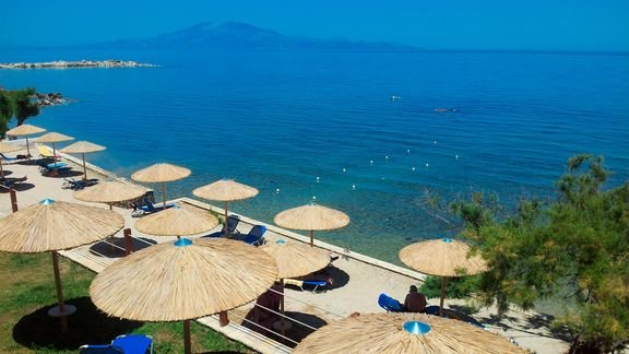 publiczna, piaszczysto-żwirowa, wąska, zejście schodami do morza, bezpośrednio przy hotelu, bezpłatne parasole i leżaki.