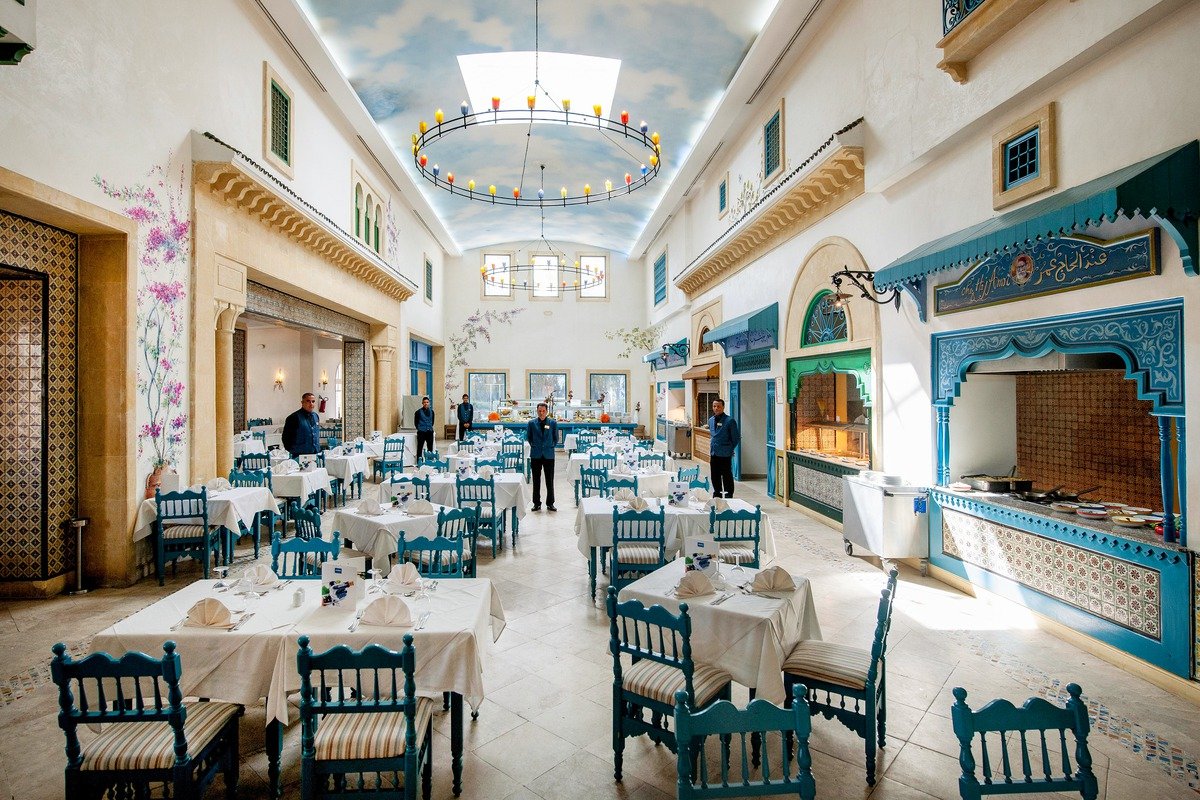 śniadanie (7.00-10.00), obiad (12.30-14.30), kolacja (19.00-21.30) w formie bufetu w restauracji Zeitouna; późne śniadanie (10.00-12.00) w snack barze; przekąski w snack barze (15.00-17.00); napoje bezalkoholowe i lokalne napoje alkoholowe w barze Shark (10.00-24.00); raz na pobyt kolacja w jednej z restauracji: śródziemnomorska w hotelu Medina Belisaire, włoska w hotelu Medina Solaria, marokańska w restauracji Medina Mediterranea (wymagana wcześniejsza rezerwacja); wstęp do Parku Carthage Land aquaparku raz na pobyt (w okresie 15.05-15.10); wejście do hammamu raz na pobyt (wymagana wcześniejsza rezerwacja); kort tenisowy (oświetlenie płatne); wymagane noszenie opasek all inclusive.