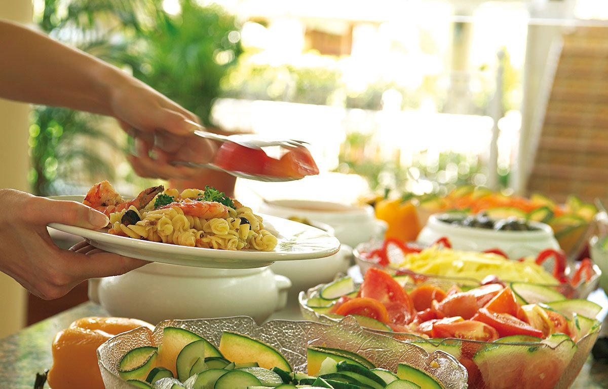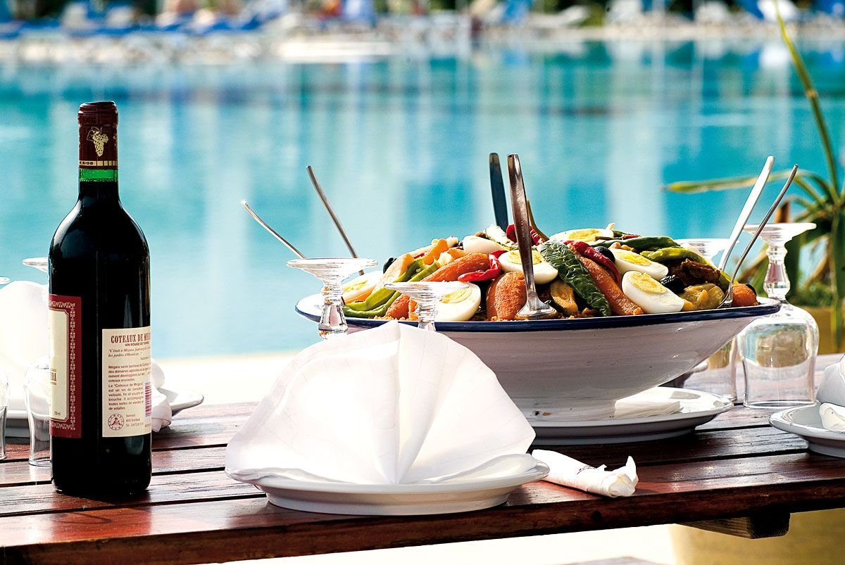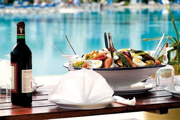 śniadanie (6.30-10.00), obiad (12.30-14.30), kolacja (19.00-21.30) w formie bufetu w restauracji głównej; obiad także w restauracji barbecue; późne śniadanie w restauracji barbecue(10.00-11.00); woda mineralna, zimne napoje bezalkoholowe, lokalne wino i piwo do obiadu i kolacji; przekąski: pizza, pasta, kanapki, naleśniki, ciasta, lody (10.30-12.00, 15.30-18.30) w wyznaczonych restauracjach i barach; kawa, herbata, gorąca czekolada, zimne napoje bezalkoholowe, lokalne alkohole w wyznaczonych barach (maj-październik: 10.00-1.00 oraz listopad-kwiecień: 10.00-24.00); raz na tydzień kolacja à la carte w snack-barze lub w restauracji à la carte (wymagana wcześniejsza rezerwacja); dodatkowo: lodówka codziennie uzupełniana w wodę i napoje bezalkoholowe; wymagane noszenie opasek all inclusive.
