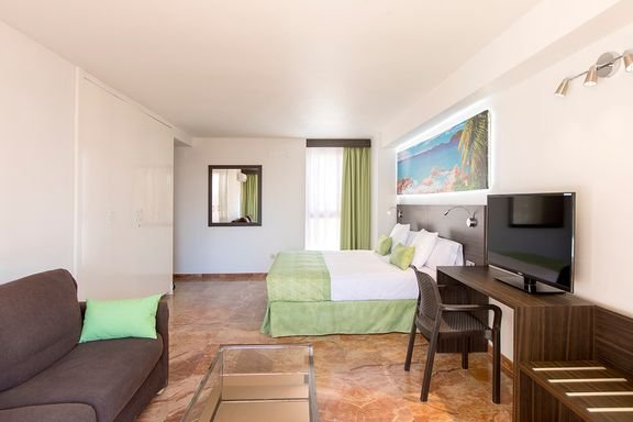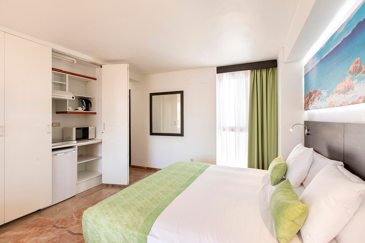 dla maks. 5 os. (w tym maks. 4 os. dorosłe), przestronny, zadbany ok. 35-50 m², sypialnia i salon z wyposażonym aneksem kuchennym, w salonie dostawka – rozkładana sofa, indywidualnie sterowana klimatyzacja (bezpłatna 19.06-30.09), łazienka (wanna, prysznic, wc), internet bezprzewodowy, telewizor, telefon, lodówka, mikrofalówka, sejf (płatny); bezpłatne łóżeczko dla dziecka do 2 lat na zamówienie przed przyjazdem; balkon (stolik i krzesełka); apartament z 2 sypialniami za dopłatą.