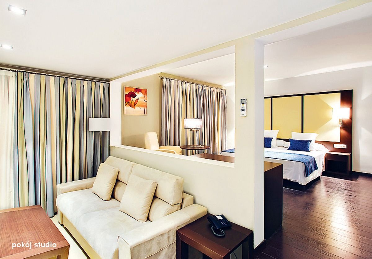 studio: dla maks. 3 os. (dostawka - sofa), ok. 25 m², elegancki i nowoczesny, indywidualnie sterowana klimatyzacja, łazienka (wanna, prysznic, wc; suszarka), telewizja satelitarna, telefon, lodówka, zestaw do kawy/herbaty, aneks kuchenny, optycznie wydzielona część sypialniana, sejf; łóżeczko dla dziecka do 2 lat na zamówienie (płatne); balkon lub taras (stolik i krzesełka); apartament: dla maks. 4 os. (dostawka - sofa), ok. 40 m², pokój dzienny z aneksem kuchennym, sypialnia oddzielona drzwiami, wyposażenie jak w studio; widok na morze na zamówienie, za dopłatą; sprzątanie, wymiana ręczników i pościeli.