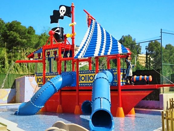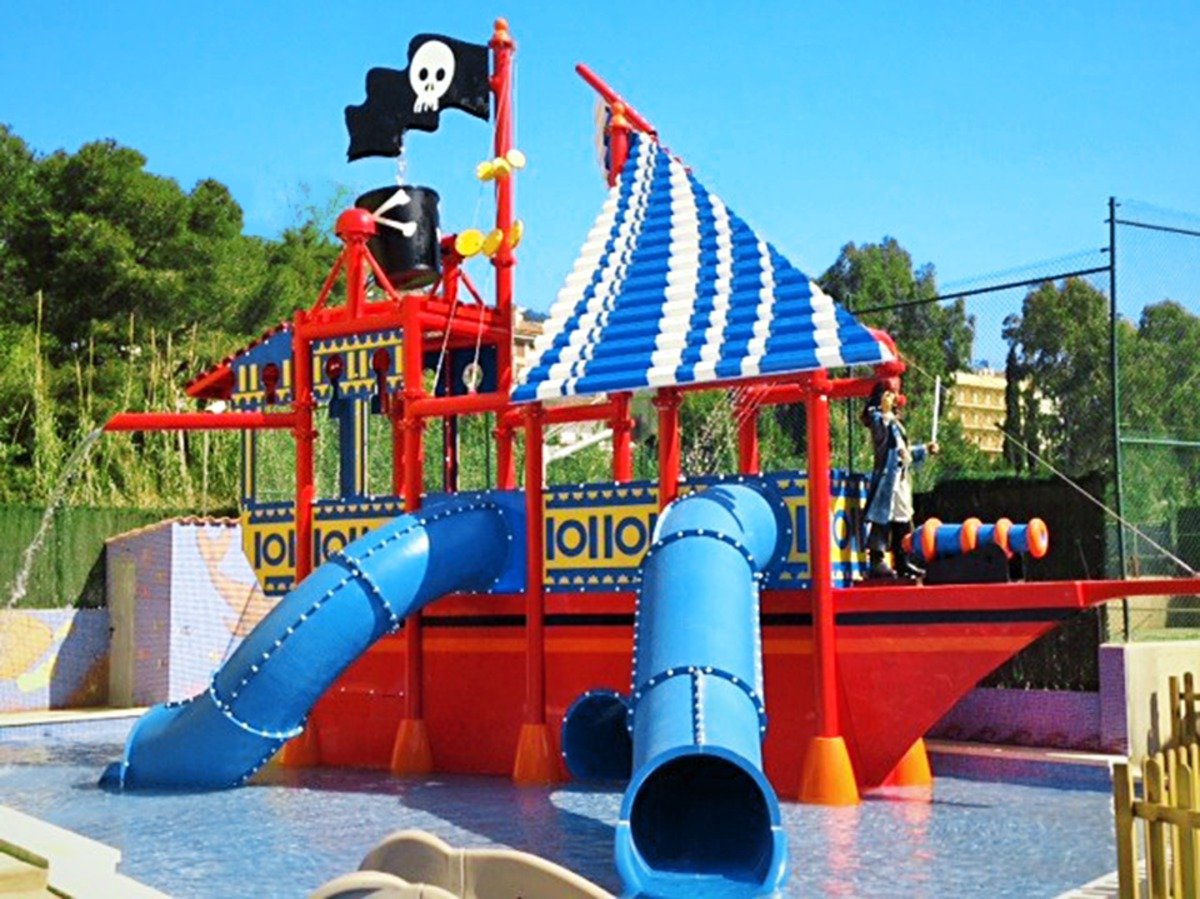 basen główny, nieregularny kształt, słodka woda, ok. 320 m², gł. 1,4 m, basen dla dzieci, słodka woda, ok. 50 m², gł. 0,2-0,5 m, basen prostokątny, słodka woda, ok. 80 m², gł. 1,2-1,6 m, zjeżdżalnie; przy basenach bezpłatne parasole, leżaki; ręczniki za kaucją (ok. 15 EUR/szt.), kort tenisowy z wypożyczalnią sprzętu (płatna, ok. 10 EUR/rakieta/depozyt), minigolf (depozyt: 10 EUR/sprzęt), wielofunkcyjne boisko sportowe, siłownia, tenis stołowy; animacje dla dzieci i dorosłych, aqua aerobic, gry wodne, minidisco, miniklub (4-12 lat), plac i pokój zabaw dla dzieci; centrum spa: basen kryty, ok. 90 m², woda słodka, gł. 1,2-1,4 m; sauna, jacuzzi, łaźnia turecka, masaże (płatne).