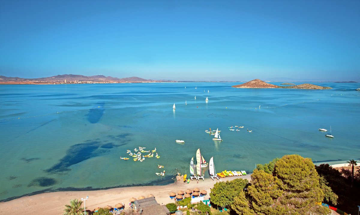 Playa del Cavanna, w lagunie Mar Menor, publiczna, piaszczysta, łagodne zejście do morza, bezpośrednio przy hotelu, dojście hotelową ścieżką, parasole i leżaki bezpłatne dla gości hotelu; Playa del Galua, publiczna, piaszczysta, łagodne zejście do morza, ok. 100 m od hotelu, dojście ulicą, parasole i leżaki płatne (ok. 12 EUR/komplet).