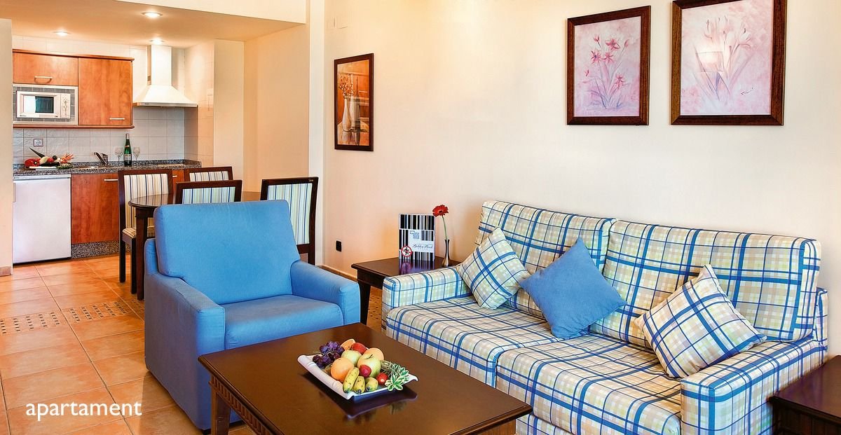 dla maks. 4 osób, ok. 60 m², komfortowo urządzony, centralna klimatyzacja z możliwością sterowania, wentylator, łazienka (wanna z prysznicem, wc; suszarka), sypialnia, salon z miejscami do spania (sofa dwuosobowa), w pełni wyposażony aneks kuchenny, telewizja satelitarna, telefon, sejf (ok. 19 EUR/tydz.); bezpłatne łóżeczko dla dziecka do 2 lat na zamówienie przed przyjazdem; widok na morze/basen za dopłatą.