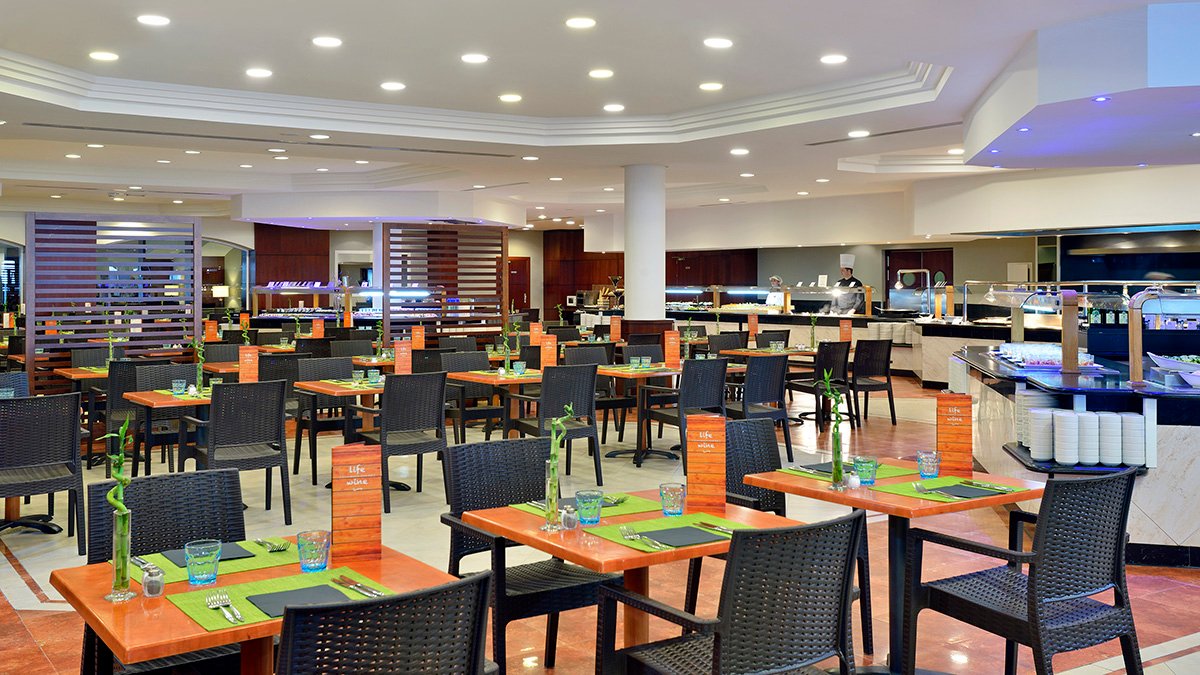śniadanie (8.00-10.00), obiad (12.30-14.30), kolacja (18.30-21.00) w formie bufetu w restauracji głównej; przekąski (10.00-12.30 i 14.30-18.30); nielimitowane napoje bezalkoholowe i lokalne napoje alkoholowe w barach (10.00-24.00); wymagane noszenie opasek all inclusive. Przy posiłkach obsługa kelnerska (napoje podawane w butelkach).