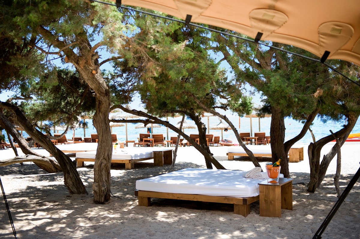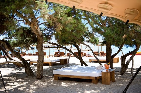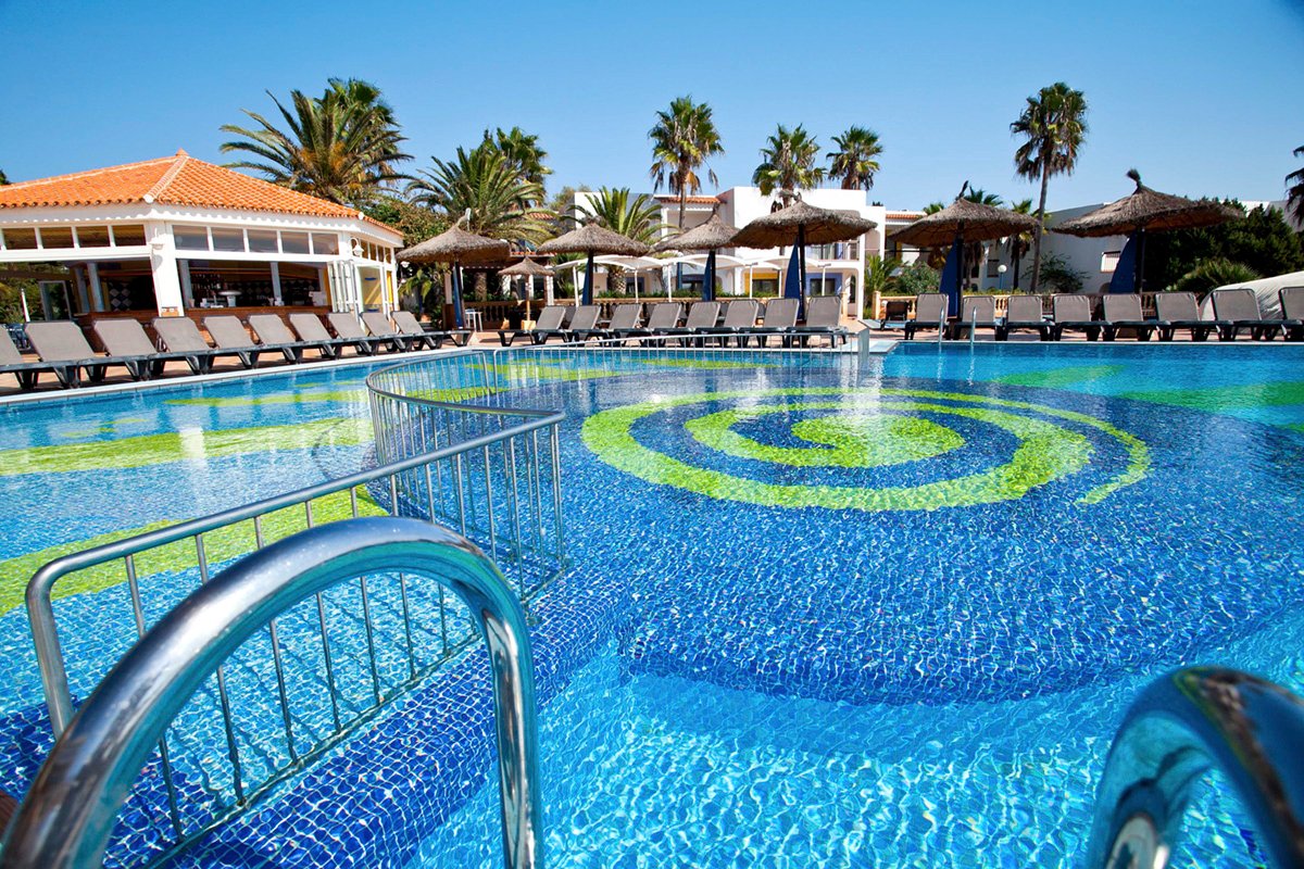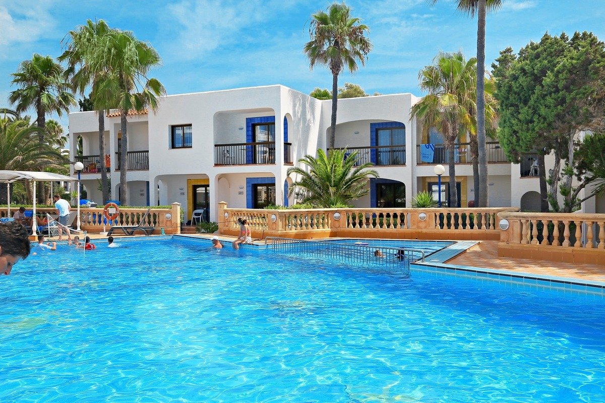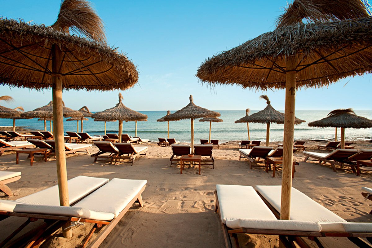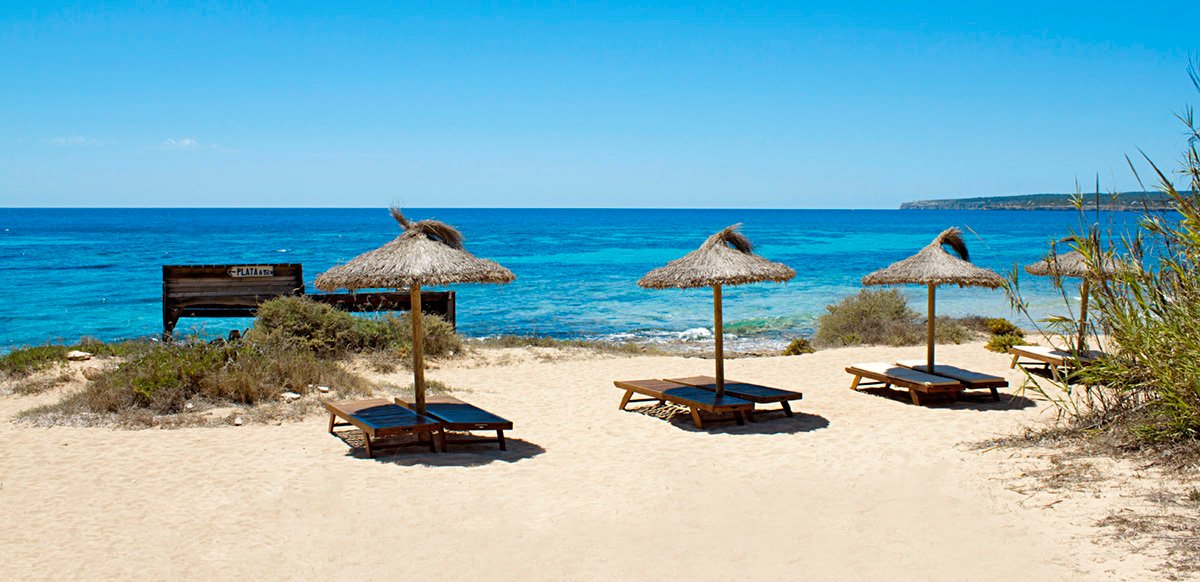 Migjorn, publiczna, piaszczysta, o jasnym piasku, najdłuższa na wyspie, łagodne zejście do morza, bezpośrednio przy hotelu, parasole, leżaki i materace płatne (ok. 12 EUR/dzień), ręczniki za kaucją do pobrania w hotelu.