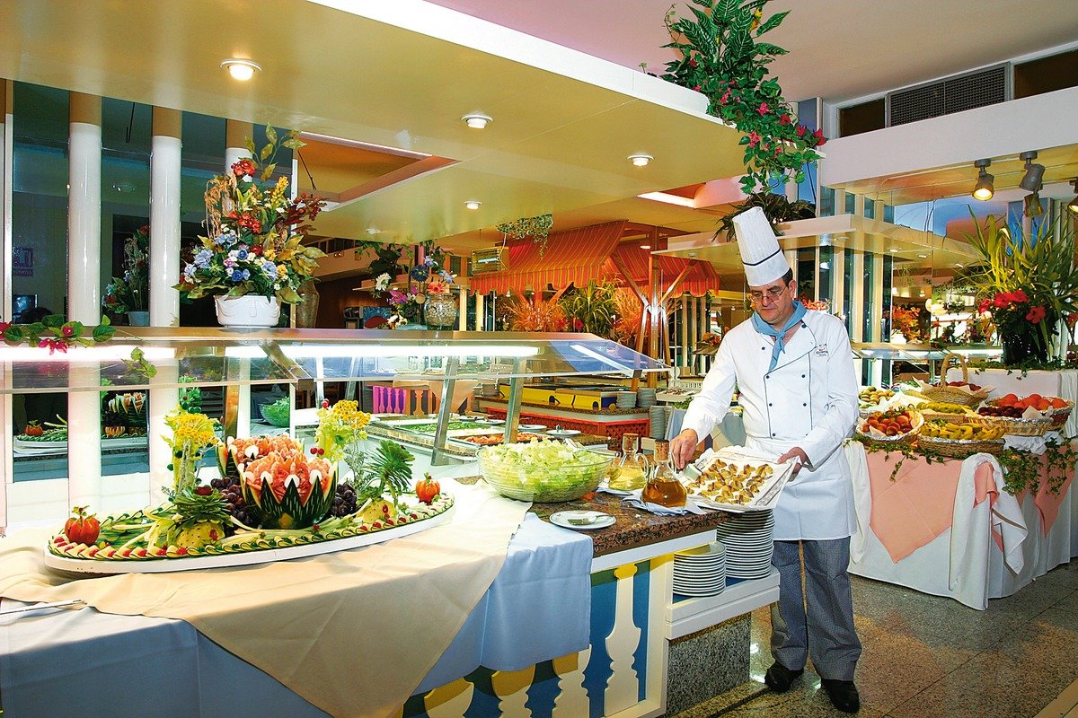 śniadanie (8.00-10.00), obiad (13.00-15.00), kolacja (19.00-22.00) w formie bufetu w restauracji; przekąski w snack barze przy basenie (10.00-18.30); napoje bezalkoholowe i lokalne napoje alkoholowe (10.00-24.00); wymagane noszenie opasek all inclusive.