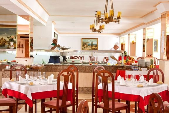 śniadanie (8.00-10.00), obiad (13.00-14.30), kolacja (19.00-21.00) w formie bufetu w restauracji; przekąski w wyznaczonym barze (10.00-23.00); napoje bezalkoholowe i lokalne napoje alkoholowe w wyznaczonym barze (10.00-23.00); wymagane noszenie opasek all inclusive.