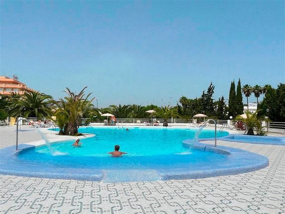 basen, nieregularny kształt, słodka woda, ok. 300 m², gł. 1-1,8 m, hydromasaż, wydzielona część dla dzieci, gł. 0,5-1 m, przy basenie bezpłatne parasole i leżaki, ręczniki (depozyt: ok. 20 EUR), minigolf, bilard, animacje dla dzieci i dorosłych (lipiec-sierpień); sporty wodne na plaży.