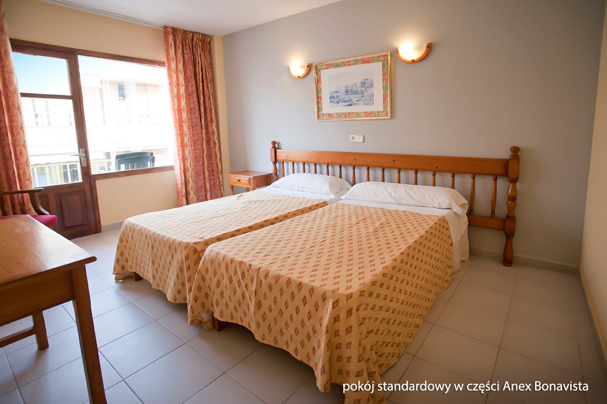 standardowy w części Anex Bonavista: 2-os. (możliwość 1 dostawki), zadbany, ok. 25 m², łazienka (wanna lub prysznic, wc; suszarka – wymagany depozyt: ok. 30 EUR), telewizja satelitarna, telefon, za opłatą: internet bezprzewodowy (ok. 5 EUR/dzień, 20 EUR/tydzień), lodówka (ok. 3 EUR/dzień), sejf (ok. 3 EUR/dzień); bezpłatne łóżeczko dla dziecka do 2 lat na zamówienie przed przyjazdem; balkon lub taras (stolik i krzesełka), widok na ulicę, góry, basen lub boczny widok na morze; pokoje w budynku głównym za dopłatą.