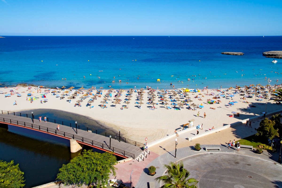 S’Illot, publiczna, piaszczysta, szeroka, jasny piasek, łagodne zejście do morza, wyróżniona certyfikatem Błękitna Flaga, przy hotelu, przejście przez promenadę, parasole i leżaki płatne (ok. 12 EUR/komplet).