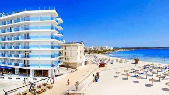 S'illot, publiczna, piaszczysta – jasny piasek, łagodne zejście do morza, wyróżniona certyfikatem Błękitna Flaga, bezpośrednio przy hotelu, przy plaży promenada, parasole i leżaki płatne (ok. 12 EUR/komplet: 2 leżaki i parasol).