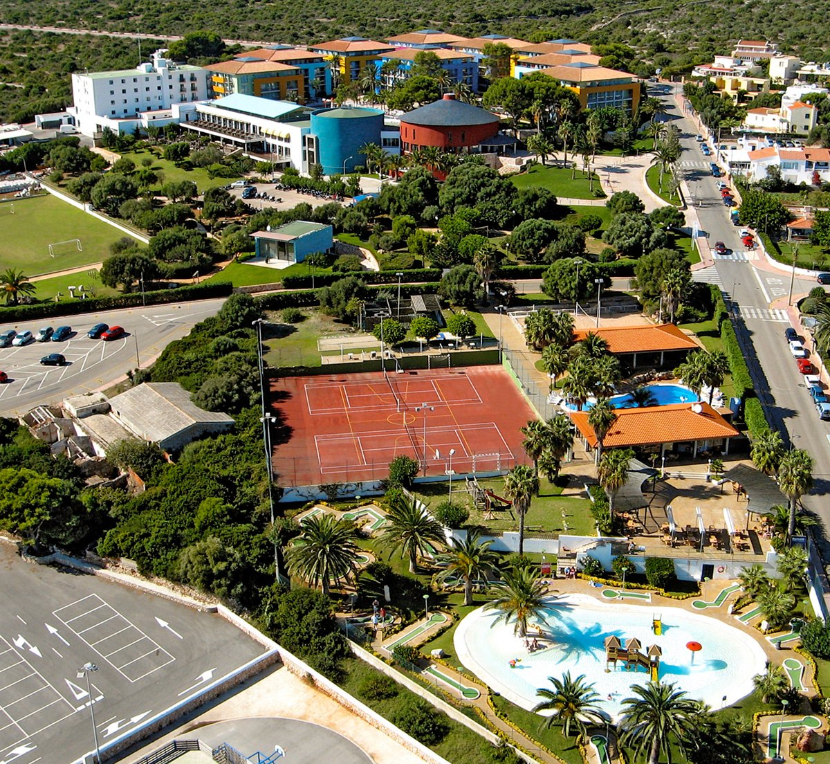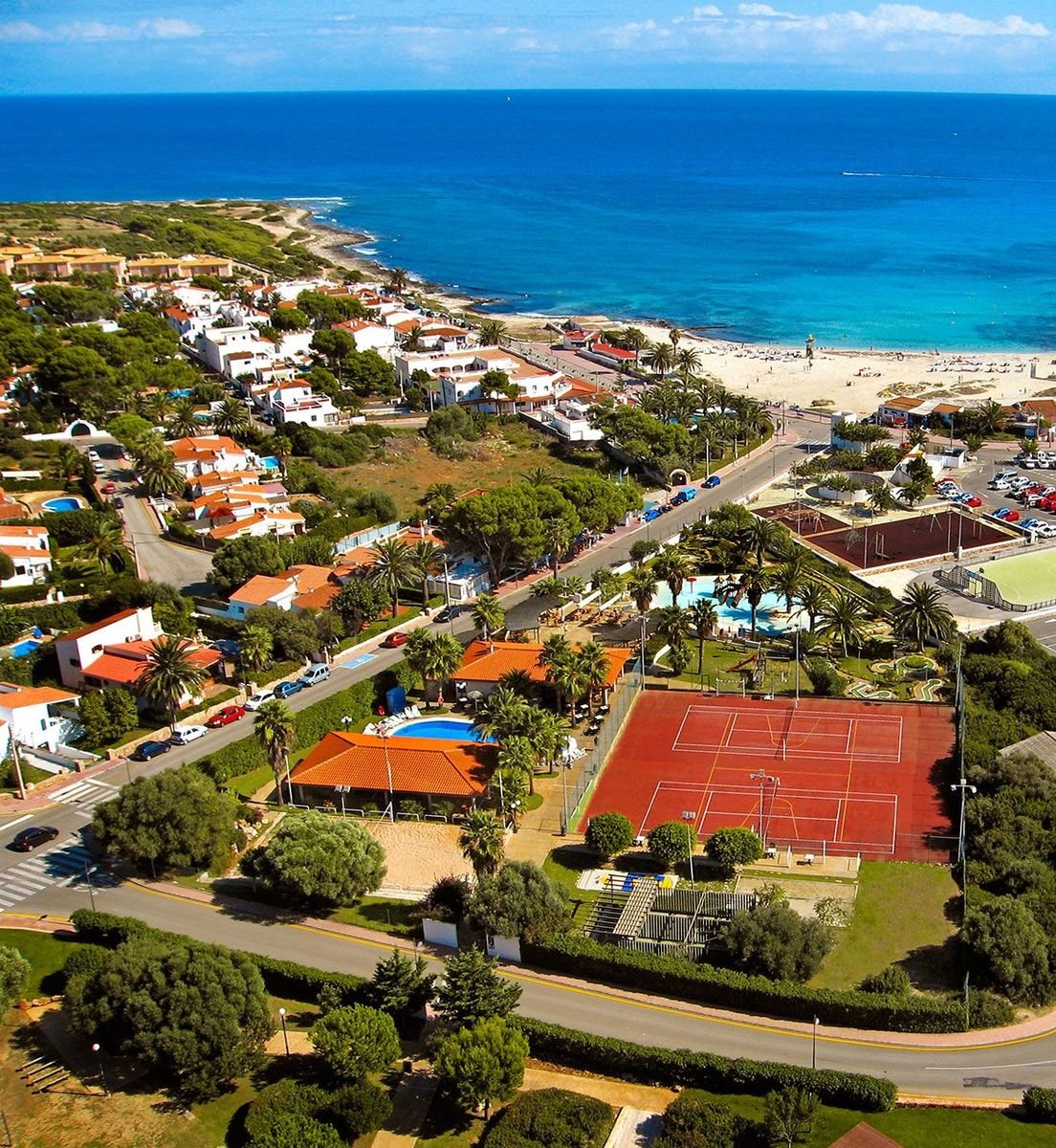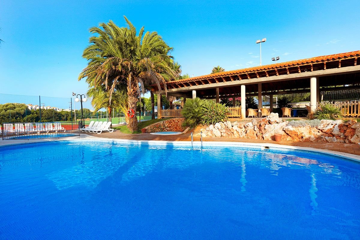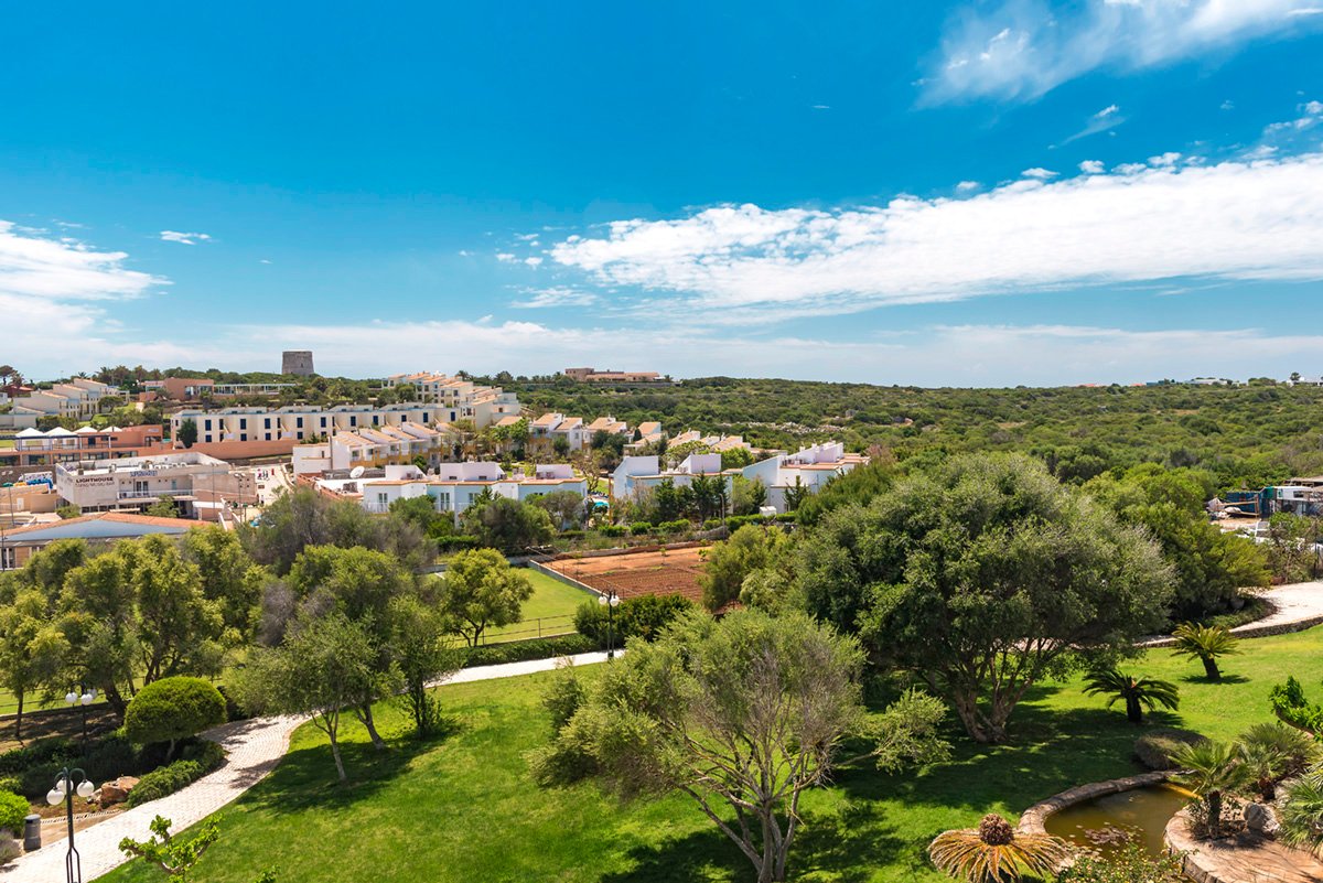 w południowo-wschodniej części Minorki, na lekkim wzniesieniu, ok. 300 m od centrum PUNTA PRIMA ze sklepami, barami i restauracjami, ok. 4,5 km od San Luis, ok. 10 km od stolicy wyspy Mahón; ok. 13 km od portu lotniczego w Mahón; przystanek autobusowy ok. 50 m od hotelu (ok. 2 EUR/Mahón).