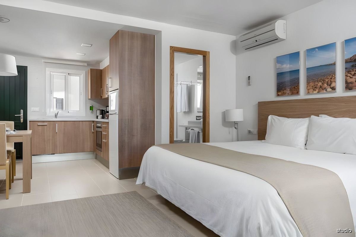 Plażowanie i beztroski relaks w cudownych okolicznościach przyrody? Tutaj odpoczniesz w przestronnych i funkcjonalnych pokojach typu studio z aneksem kuchennym lub apartamentach, a do pięknej, piaszczystej plaży w zatoce zejdziesz prosto z hotelowego tarasu! Na miejscu basen z zachwycającym widokiem na morze i leżakami. Na dzieciaki czeka tu plac zabaw, można też pograć z całą rodziną w minigolfa, a wieczorami posłuchać muzyki na żywo. Polecamy zaplanować czas na wycieczki rowerowe i zwiedzanie wyspy – okolica zachwyca!