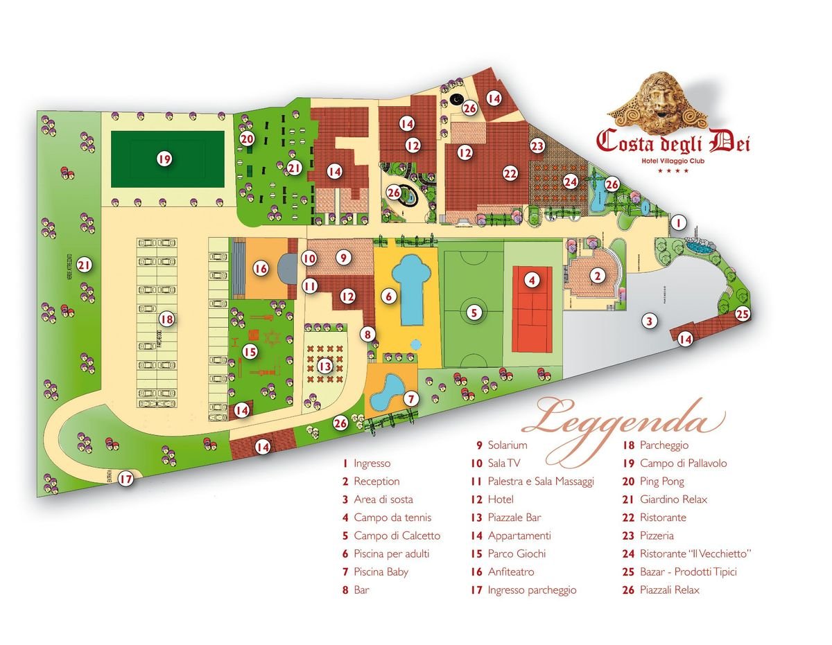 czterogwiazdkowy, zbudowany w 1997 r., odnowiony w 2003 r., 60 pokoi, 4 budynki, 2 piętra, hol, całodobowa recepcja; restauracja Costa Degli Dei – dania w formie bufetu, obsługa kelnerska, kuchnia włoska i międzynarodowa, restauracja Tipico il Vecchietto – à la carte, kuchnia włoska, w restauracjach dostępne foteliki i menu dla dzieci, dania wegetariańskie, 3 bary, w tym snackbar na plaży i bar przy basenie; sklep z pamiątkami, przechowalnia bagażu, wypożyczalnia rowerów (ograniczona ilość); centrum konferencyjne dla 60 osób, taras z widokiem na morze, ogród; za opłatą: punkt internetowy, internet bezprzewodowy, sejf w recepcji, room-service, pralnia i prasowalnia; akceptowane zwierzęta domowe do 3 kg (płatne: ok. 5 EUR/dzień); występują różnice poziomów; akceptowane karty kredytowe: Visa, MasterCard, American Express.