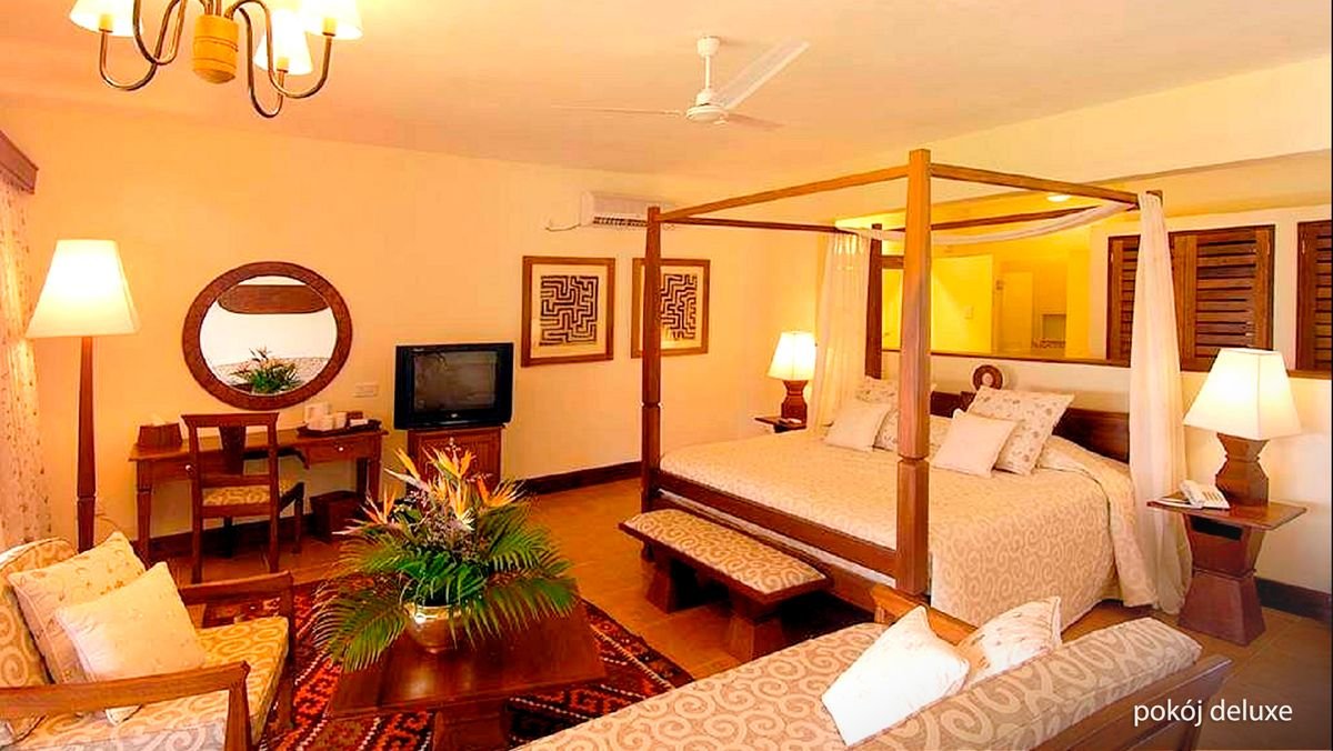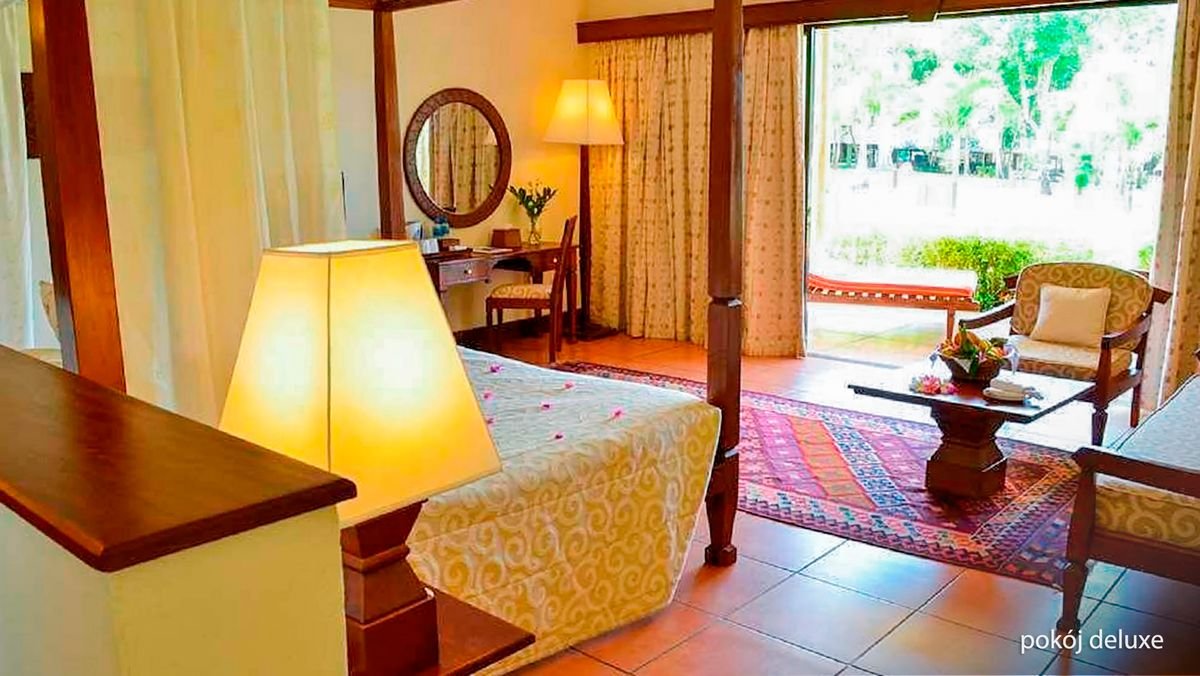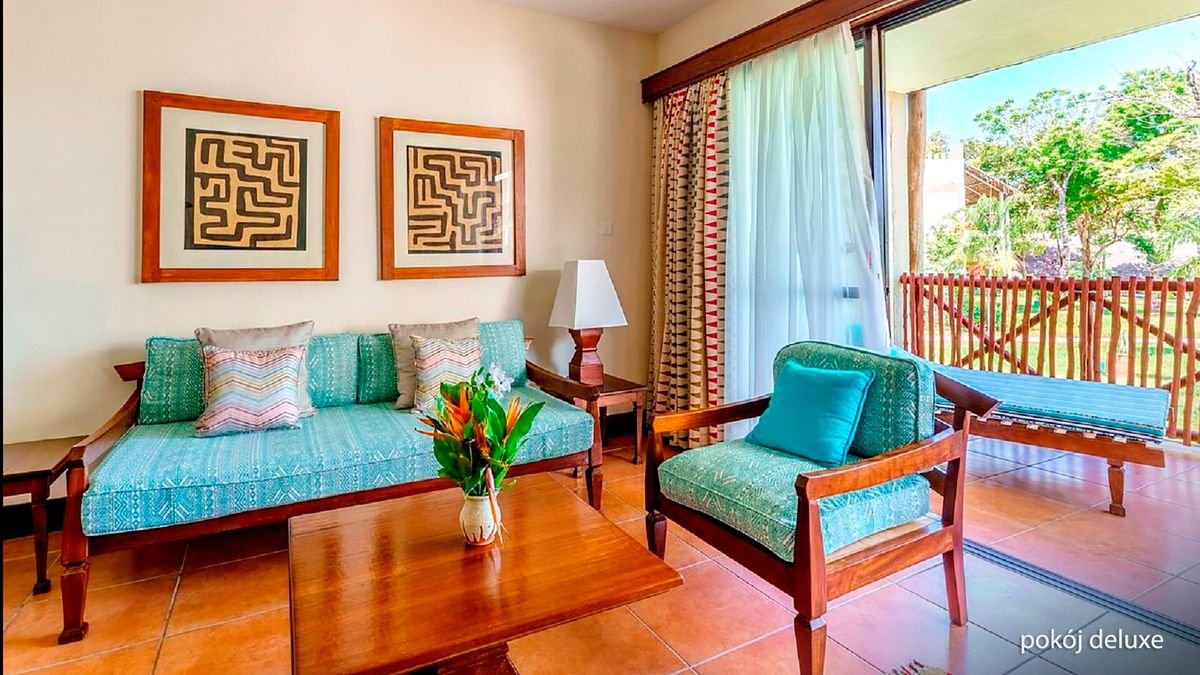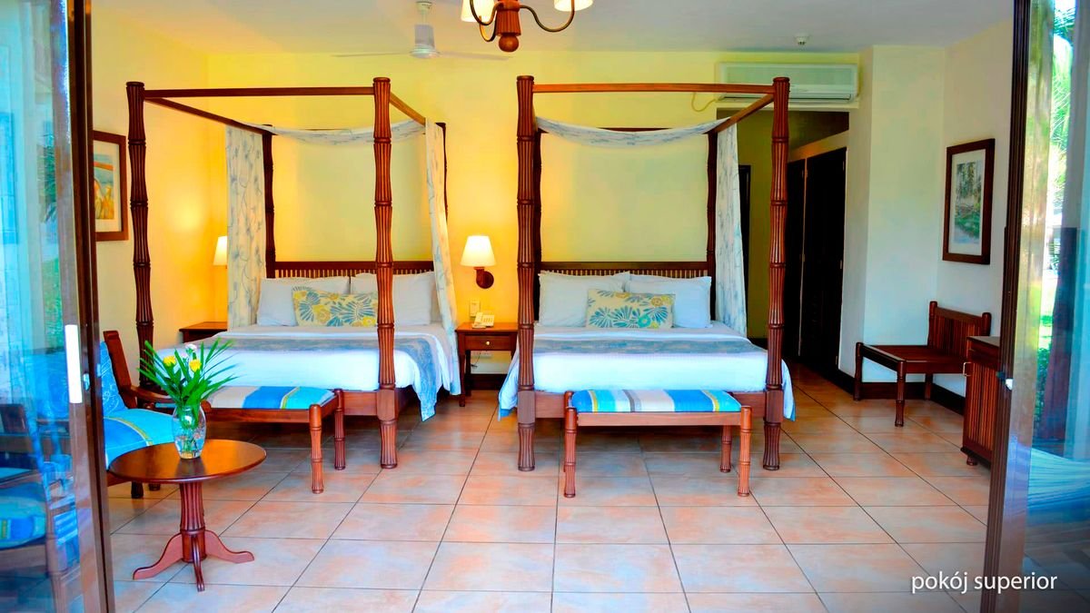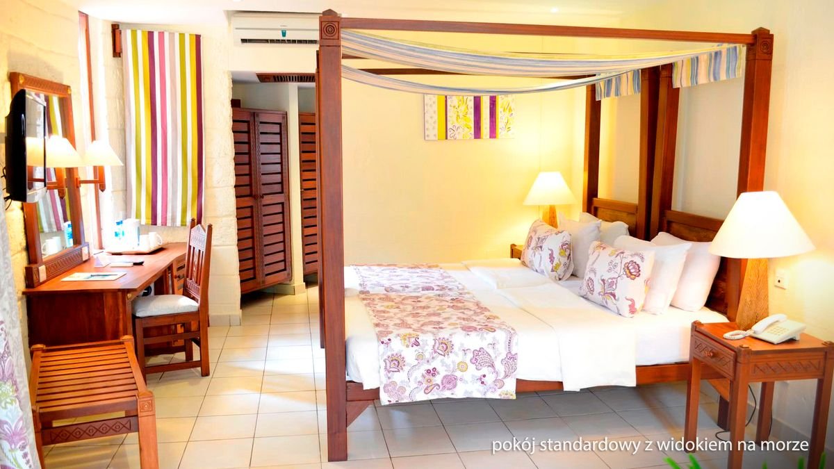 standardowy z widokiem na morze: 2-os. (możliwość 1 dostawki), ok. 31 m2, indywidualnie sterowana klimatyzacja, łazienka (prysznic, wc; suszarka), internet bezprzewodowy, telewizja satelitarna, telefon, minilodówka, sejf, zestaw do parzenia kawy/herbaty; bezpłatne łóżeczko dla dziecka do 2 lat na zamówienie przed przyjazdem; balkon lub taras, częściowy widok na morze; superior: 2-os. (możliwość 1 dostawki dla os. dorosłej lub 2 dostawek dla dzieci), ok. 63 m2, 2 łóżka queen size, indywidualnie sterowana klimatyzacja, łazienka (prysznic, wc; suszarka, zestaw kosmetyków, szlafroki), wyposażenie jak w pokoju standardowym z widokiem na morze; balkon lub taras, widok na basen lub ogród; część pokoi z widokiem na morze; deluxe: 2-os. (możliwość 1 dostawki dla os. dorosłej lub 2 dostawek dla dzieci), ok. 70 m2, indywidualnie sterowana klimatyzacja, łazienka (prysznic, wc; suszarka, zestaw kosmetyków, szlafroki), wyposażenie jak w pokoju standardowym z widokiem na morze; balkon lub taras, widok na basen lub ogród; część pokoi z widokiem na morze; owoce za dopłatą; pokój superior i deluxe za dopłatą.