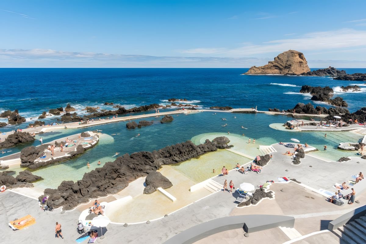 naturalne baseny lawowe, betonowe platformy do opalania, zejście do wody po schodach, przy hotelu; naturalne baseny przy Aquario da Madeira, betonowe platformy do opalania, zejście do wody po schodkach lub drabince, ok. 500 m od hotelu.
