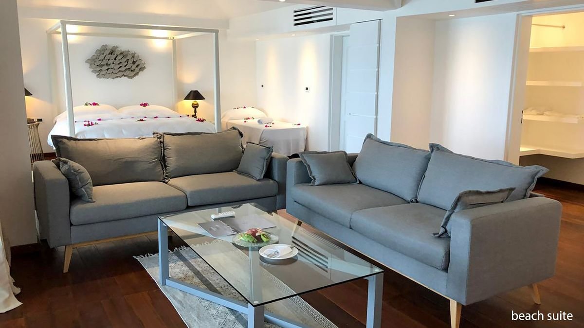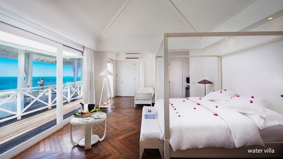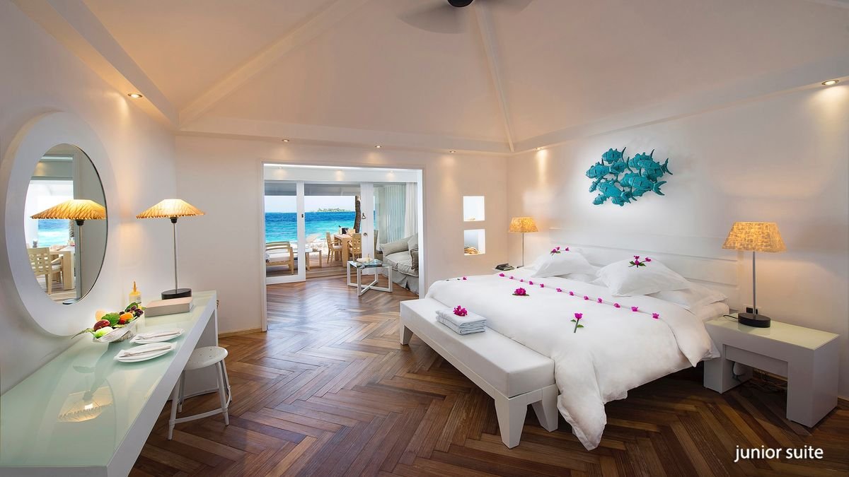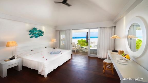 beach bungalow: 2-os. (możliwość 1 dostawki), ok. 30 m², indywidualnie sterowana klimatyzacja, wentylator sufitowy, łazienka (wc; bidet, suszarka, szlafroki i kapcie), prysznic zewnętrzny, internet bezprzewodowy, telefon, minibar (codziennie uzupełniany w wodę, napoje bezalkoholowe i piwo), zestaw do kawy/herbaty, sejf; bezpłatne łóżeczko dla dziecka do 2 lat na zamówienie przed przyjazdem; taras (stolik i krzesełka), bezpośrednie zejście na plażę, frontalny widok na morze; junior suite: 2-os. (możliwość 1 lub 2 dostawek dla dzieci – sofa), ok. 40 m², część dzienna i sypialnia wydzielone optycznie, łazienka (wc; bidet, suszarka, szlafroki i kapcie), prysznic zewnętrzny, wyposażenie jak w pokoju beach bungalow; beach suite: 2-os. (możliwość 2 dostawek), ok. 91 m2, wyposażenie jak w beach bungalow; duży taras (stolik i krzesełka); water villa: 2-os. (możliwość 1 dostawki dla os. dorosłej), ok. 50 m², łazienka (prysznic, wc; bidet, suszarka, szlafroki i kapcie), wyposażenie jak w pokoju beach bungalow, minibar (codziennie uzupełniany w wodę, napoje bezalkoholowe, piwo i wino), dodatkowo: Apple iMac z dostępem do filmów; water villa z jacuzzi na zamówienie; pokoje: junior suite, beach suite, water villa i water villa z jacuzzi za dopłatą; w pokojach water villa i water villa z jacuzzi mogą przebywać dzieci od 12 roku życia.