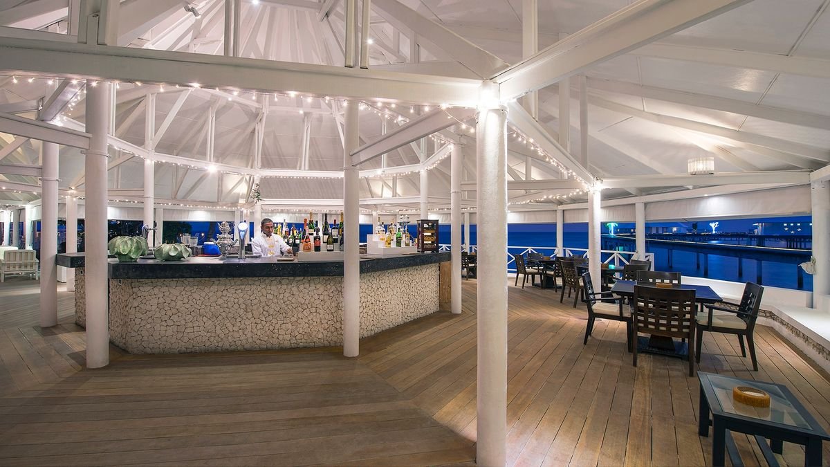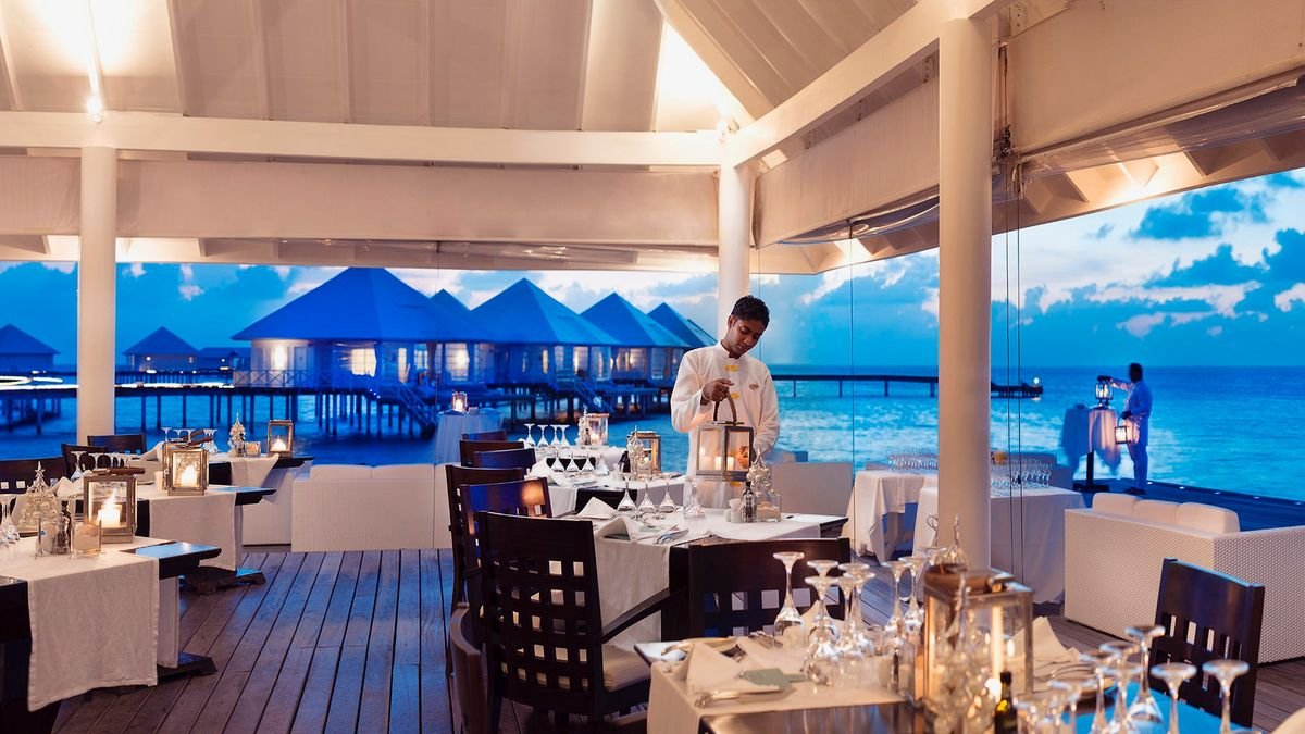 śniadanie (8.00-10.30), obiad (13.00-14.30) i kolacja (20.00-21.30) w restauracji głównej (dla klientow zakwaerowanych w water willa w restauracji Aqua); przekąski w wyznaczonych godzinach w barze na plaży; napoje bezalkoholowe i lokalne napoje alkoholowe (10.00-24.00) w wyznaczonych barach; wymagane noszenie opasek all inclusive.