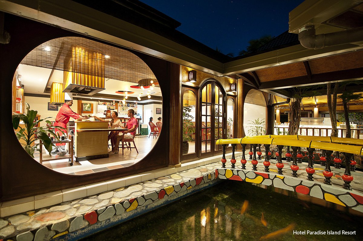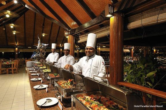 śniadanie (7.30-9.30), obiad (12.30-14.00), kolacja (19.30-21.00) w formie bufetu w restauracji głównej; napoje bezalkoholowe i lokalne napoje alkoholowe w barze Hulhangu (10.00-1.00); minibar uzupełniany raz dziennie: napoje chłodzące i woda; wymagane noszenie opasek all inclusive; wszystkie napoje serwowane w szklanych naczyniach.
