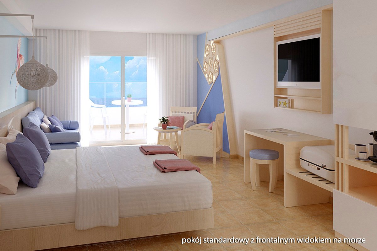 standardowy: 2-os. (możliwość 1 dostawki), ok. 32 m², urządzony ze smakiem, indywidualnie sterowana klimatyzacja i ogrzewanie, łazienka (prysznic, wc; suszarka), telewizja satelitarna, telefon; za opłatą: sejf (ok. 3 EUR/dzień), minibar; bezpłatne łóżeczko dla dziecka do 2 lat na zamówienie przed przyjazdem; balkon lub taras (stolik i krzesełka); boczny lub frontalny widok na morze za dopłatą; rodzinny: 2-os. (możliwość 1 lub 2 dostawek), ok. 35-40 m², wyposażenie jak w pokoju standardowym; widok na ogród; pokój rodzinny za dopłatą.