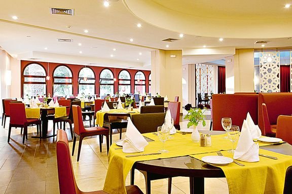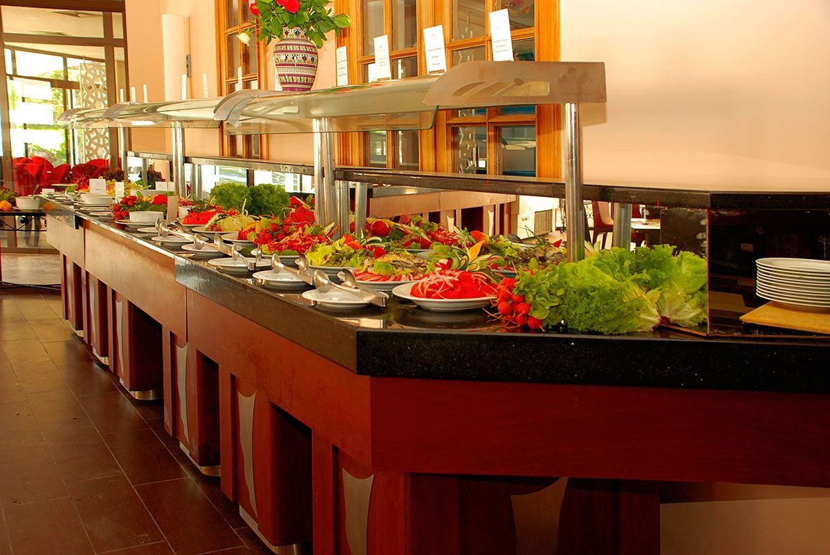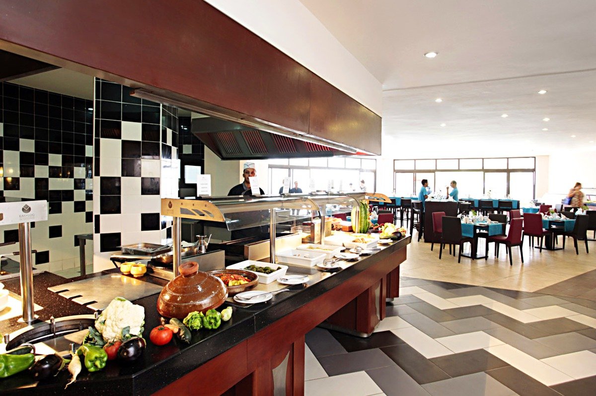 śniadanie (6.00‑10.00), obiad (12.30-15.00), kolacja (19.30‑22.00) w formie bufetu w restauracji głównej; lokalne napoje bezalkoholowe i alkoholowe w barze (10.00-23.00); wymagane noszenie opasek all inclusive.