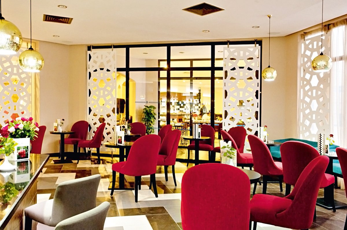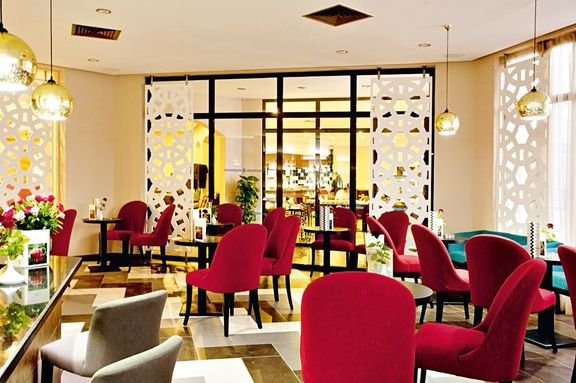 czterogwiazdkowy, zbudowany w 1975 r., całkowicie odnowiony w 2013 r., łącznie 236 pokoi i suitów, 2 budynki 7-piętrowe, w każdym po 2 windy, 1 budynek parterowy, przestronne lobby, całodobowa recepcja, restauracja główna Le Riad z tarasem – dania w formie bufetu, kuchnia międzynarodowa, raz w tygodniu wieczór marokański, dostępne dania wegetariańskie, English Bar w lobby i bar przy basenie; kantor; sala konferencyjna dla ok. 35 osób, taras, ogród, bezpłatny internet bezprzewodowy w recepcji; za opłatą: kawiarenka internetowa (ok. 20 MAD/godz.), room-service, fryzjer; akceptowane karty kredytowe: Visa, MasterCard, American Express.